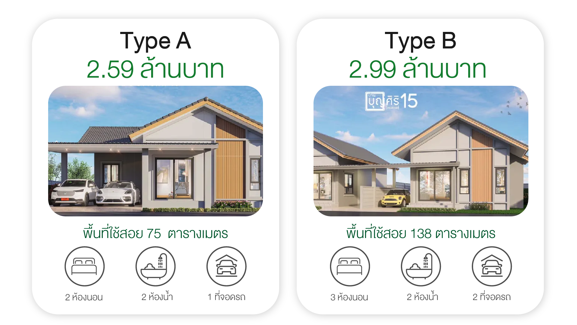 - แบบบ้าน Type B (พื้นที่ใช้สอย 138 ตร.ม.): ฟังก์ชัน 3 ห้องนอน 2 ห้องน้ำ และจอดรถ 2 คัน บนที่ดินขนาดใหญ่ตั้งแต่ 60-80 ตร.วา (ราคาเริ่มต้น 2.99 ล้านบาท)
