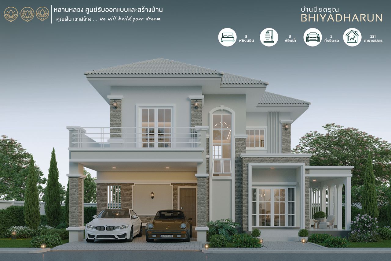รับสร้างบ้านหลานหลวง บ้าน 2 ชั้นสไตล์โมเดิร์นคลาสสิคผสมกับ นีโอคลาสสิค 4 ห้องนอน 3 ห้องน้ำ ชื่อแบบบ้าน ปิยดรุณ