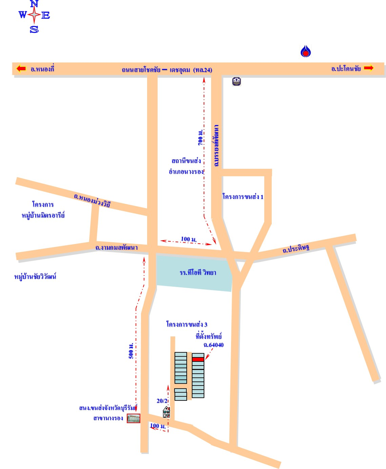 ที่ตั้ง : จากถนนสายโชคชัย-เดชอุดม (ทล.24) แยกเข้าถนนบรรยงศ์พัฒนา ผ่านถนนงามกมลพัฒนา ถึงที่ตั้งทรัพย์ประมาณ 1.4 กม. ตำบลนางรอง