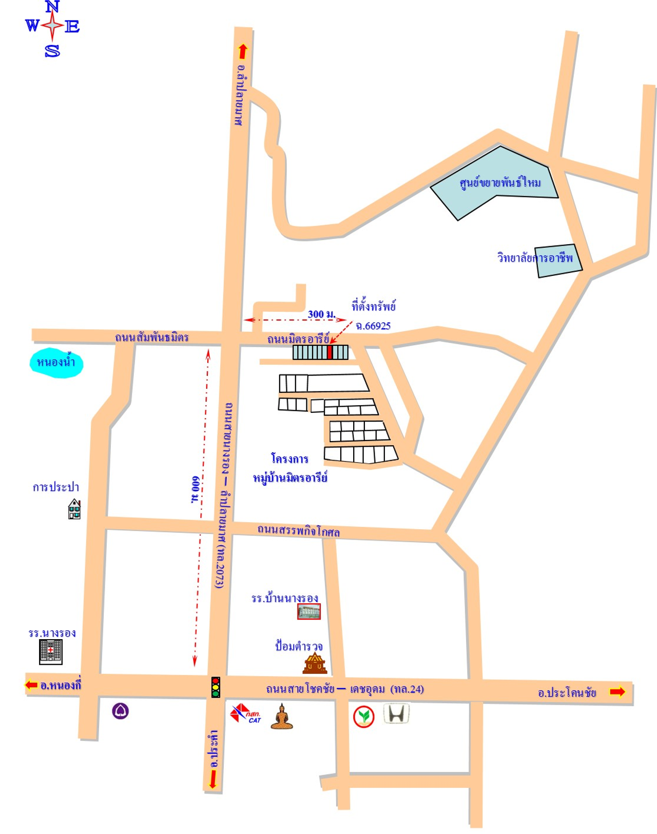 ที่ตั้ง : จากถนนสายนางรอง-ลำปลายมาศ (ทล.2073) แยกเข้าถนนมิตรอารีย์ประมาณ 300 เมตร ตำบลนางรอง