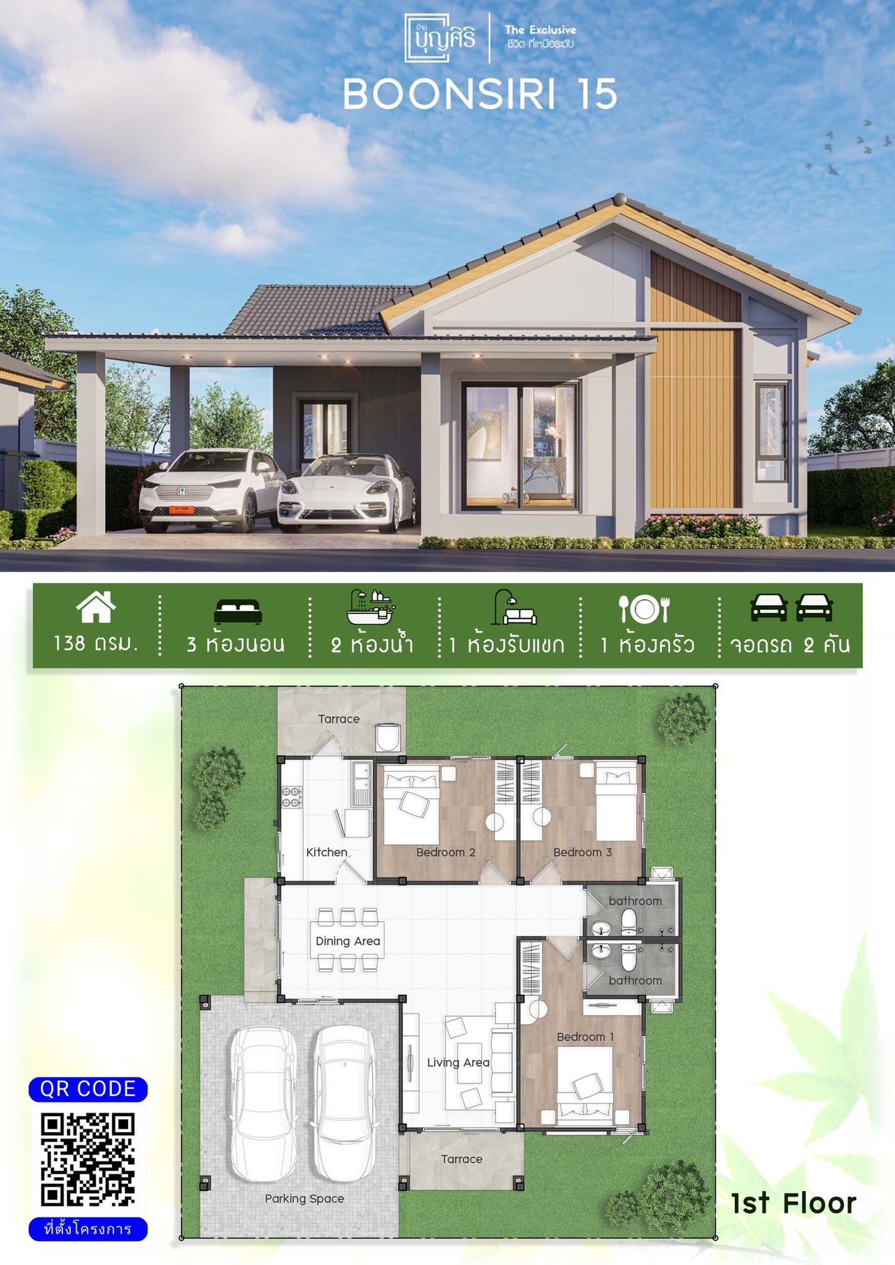 จอดรถได้ 2 คัน | 3 ห้องนอน | 2 ห้องน้ำ | 1 ห้องครัว | 1 ห้องโถง