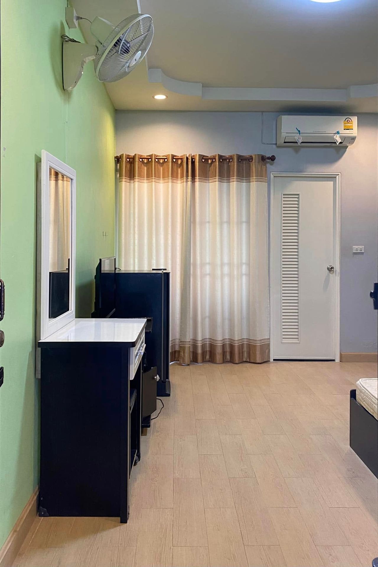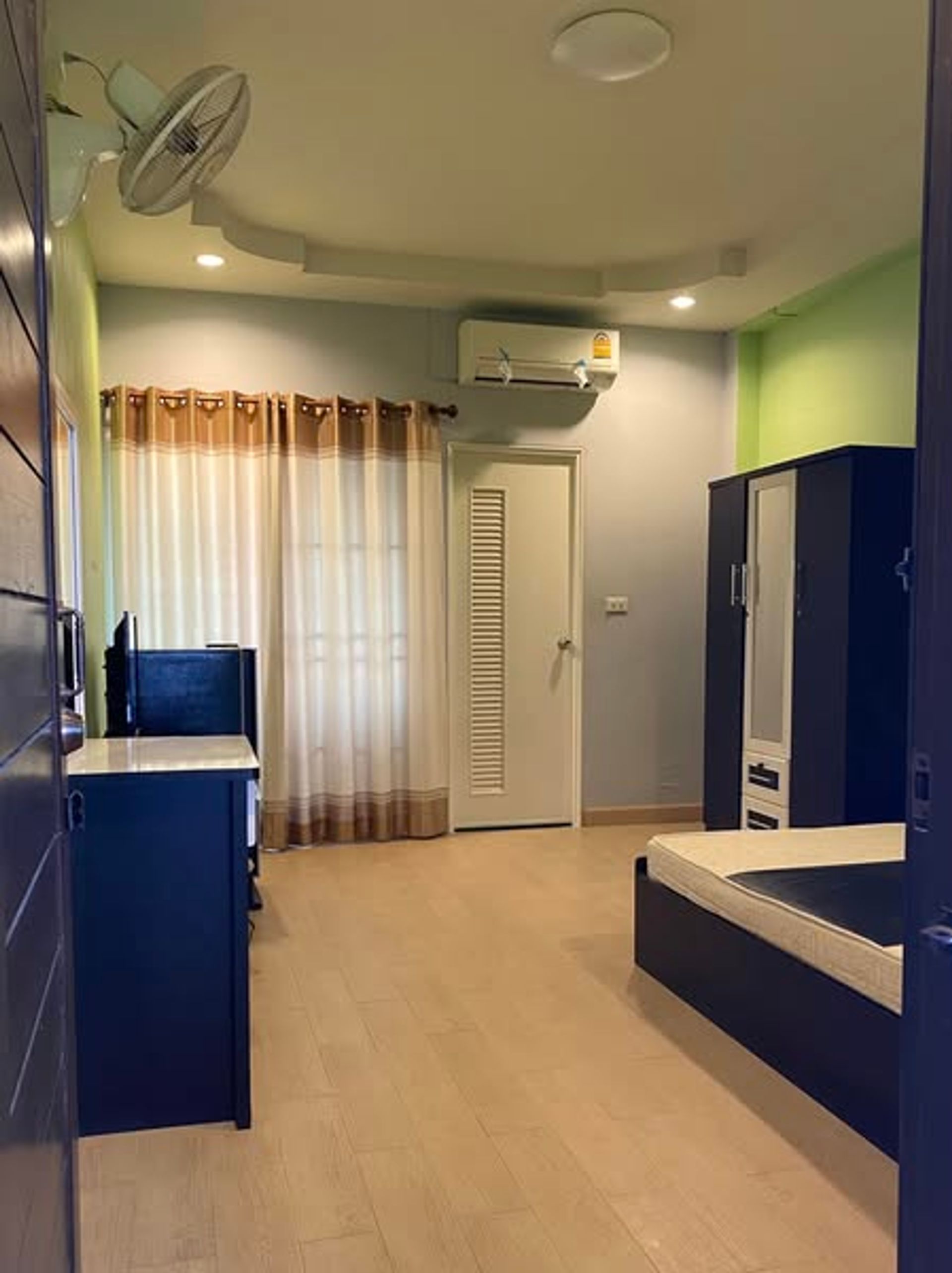 - แอร์ + พัดลมติดผนัง: ห้องพักมีทั้ง แอร์ และ พัดลมติดผนัง เพื่อความเย็นสบายตลอดทั้งวัน