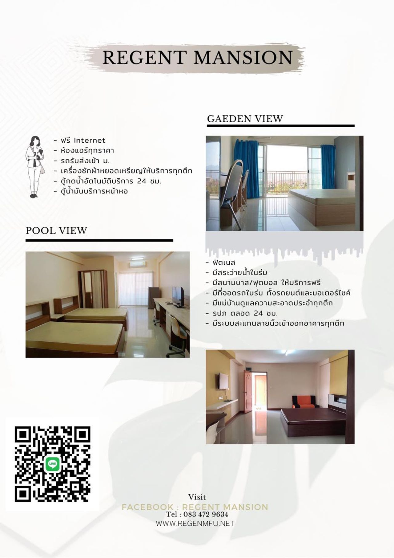 นอกจากห้องพักที่สะดวกสบายแล้ว รีเจนท์ แมนชั่น ยังมีบริการและสิ่งอำนวยความสะดวกอื่นๆ ที่ตอบโจทย์การใช้ชีวิตอย่างครบครัน: