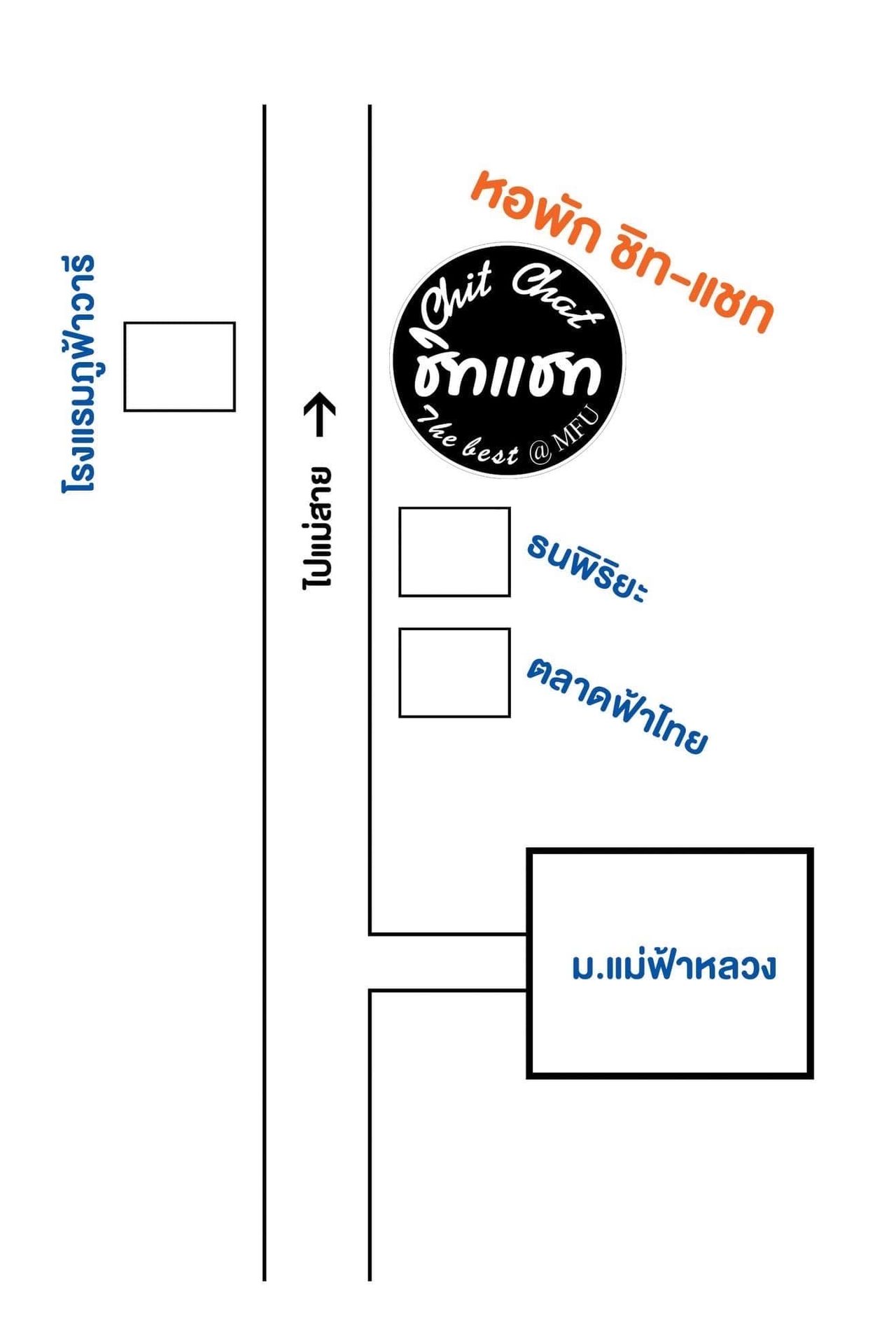 หอพัก Chit Chat ตั้งอยู่ในทำเลที่สะดวกสบาย ใกล้กับ มหาวิทยาลัยแม่ฟ้าหลวง ทำให้สะดวกในการเดินทางไปเรียน หรือทำกิจกรรมต่าง ๆ ที่มหาวิทยาลัย นอกจากนี้ยังใกล้กับ ตลาดฟ้าไทย, ร้านธนพิริยะ, ร้านอาหารจงหัว, และร้านสะดวกซื้ออื่น ๆ อีกมากมาย ที่จะทำให้คุณไม่ต้องเสียเวลาเดินทางไปหาของกินหรือสินค้าจำเป็น