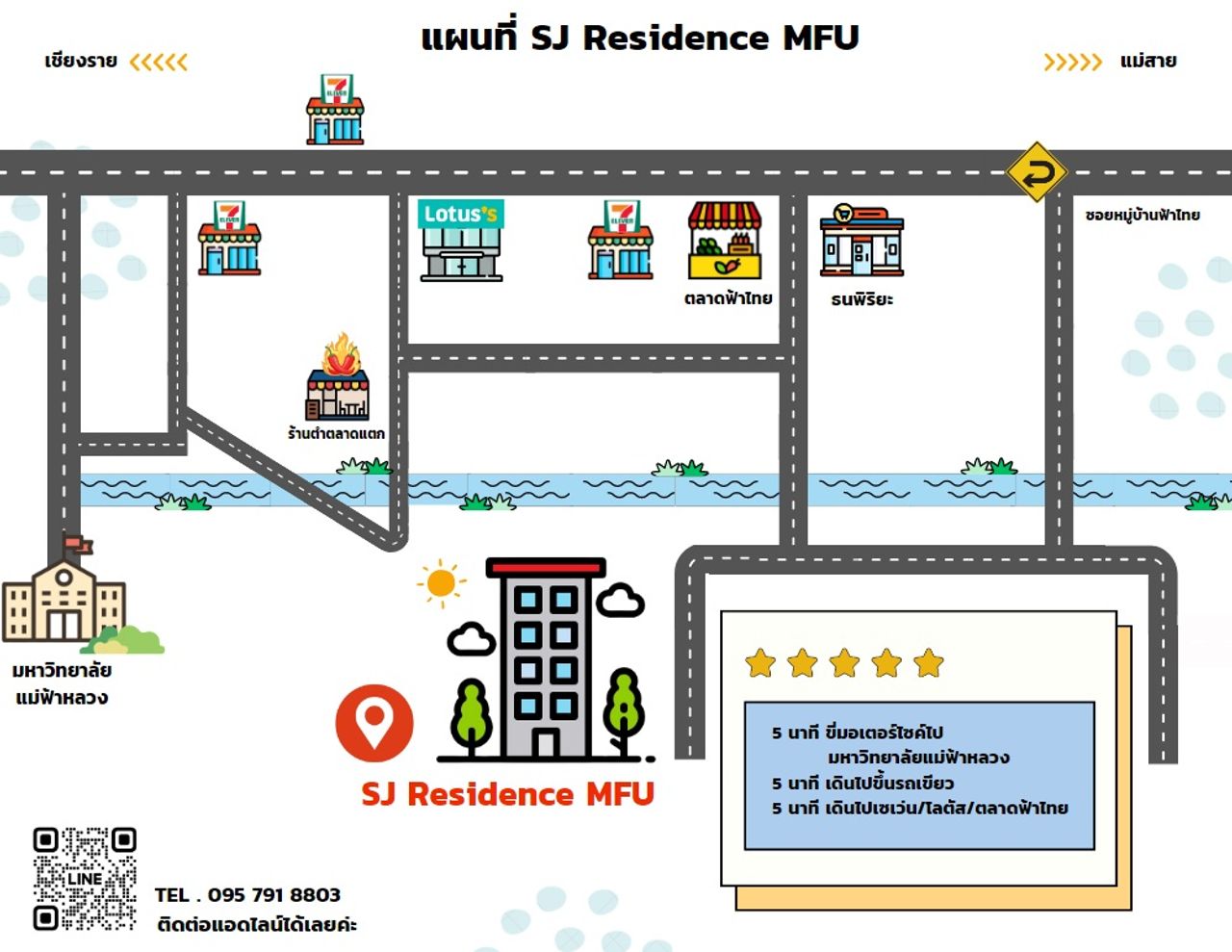 SJ Residence MFU ตั้งอยู่ในทำเลที่สะดวกสบาย ใกล้กับ มหาวิทยาลัยแม่ฟ้าหลวง ซึ่งทำให้การเดินทางไปเรียนหรือทำงานสะดวกมาก โดยหอพักนี้อยู่ห่างจากมหาวิทยาลัยเพียงไม่กี่นาทีเท่านั้น นอกจากนี้ยังใกล้กับแหล่งชุมชนและร้านอาหารต่างๆ ที่ช่วยให้ชีวิตประจำวันของคุณสะดวกยิ่งขึ้น