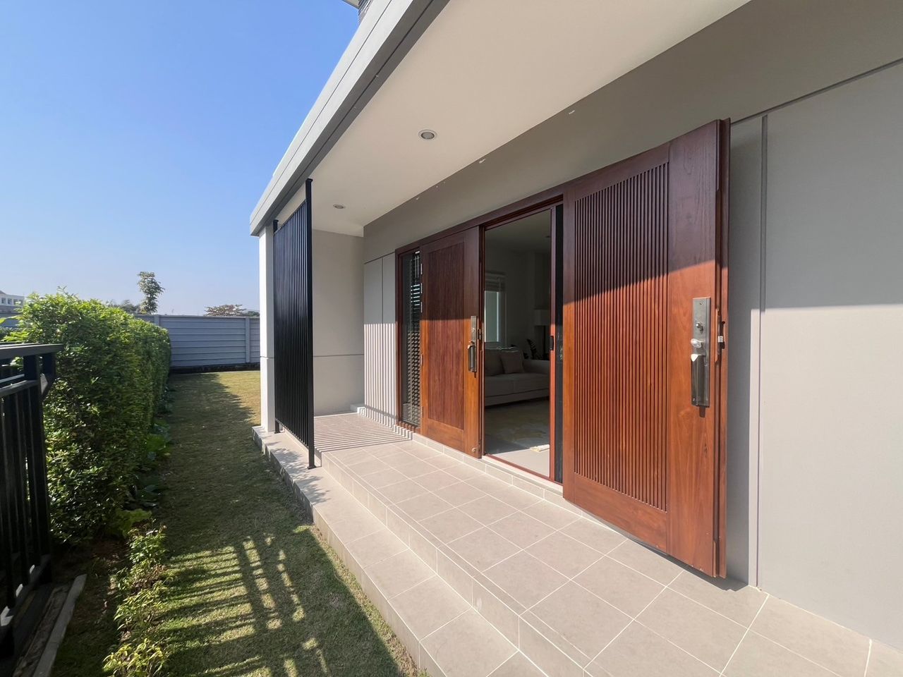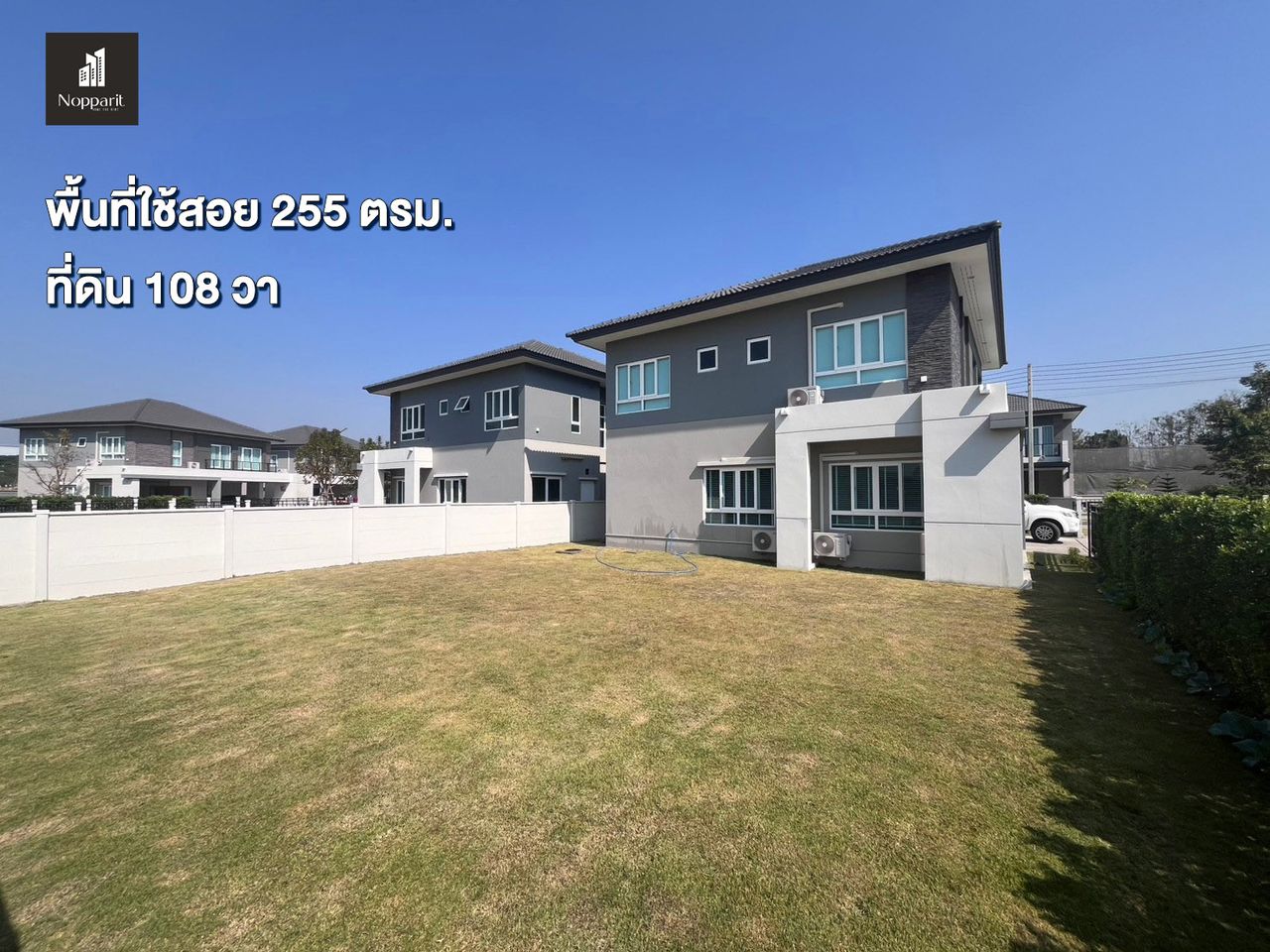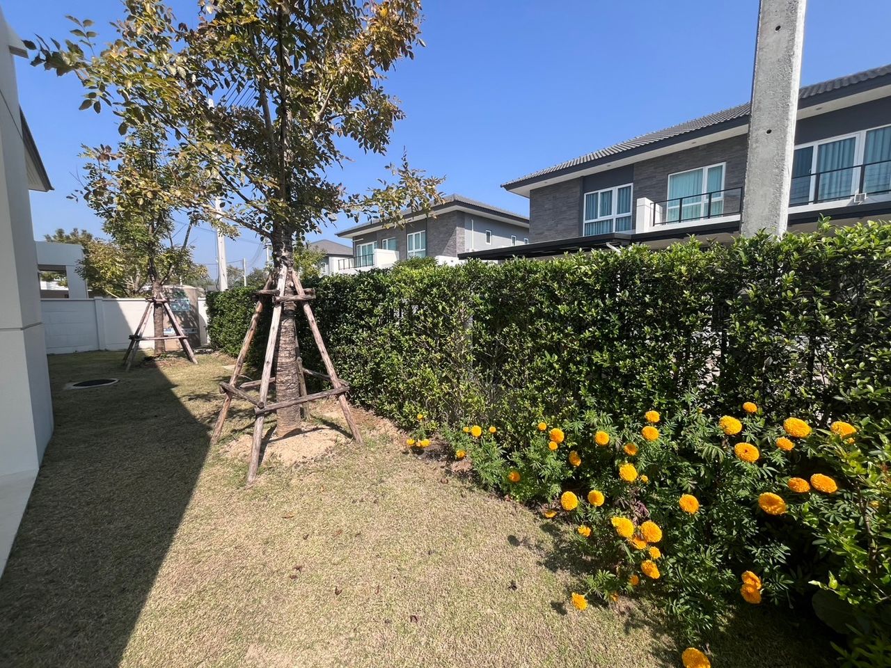 มีลานสนามหญ้ากว้างข้างบ้าน