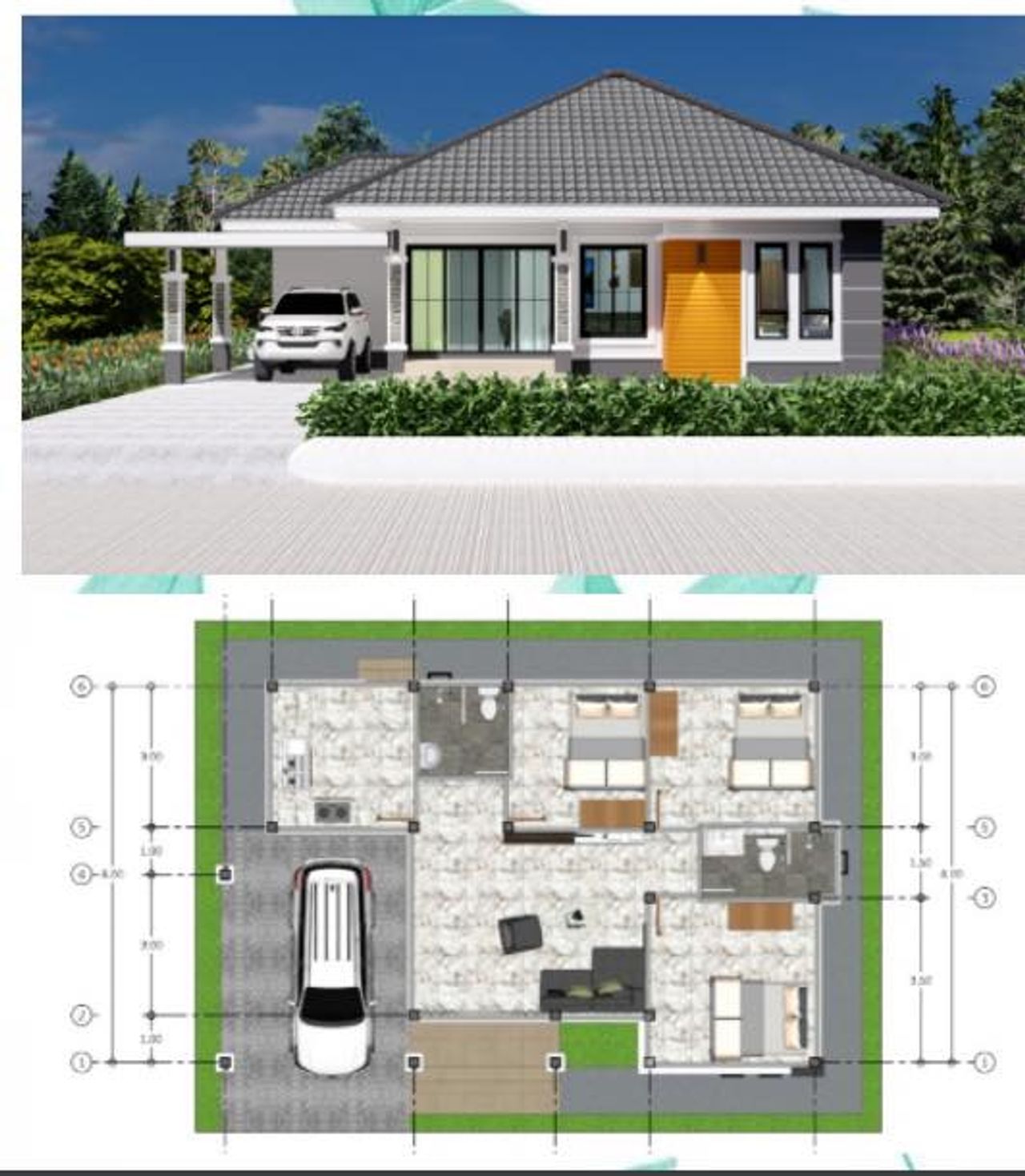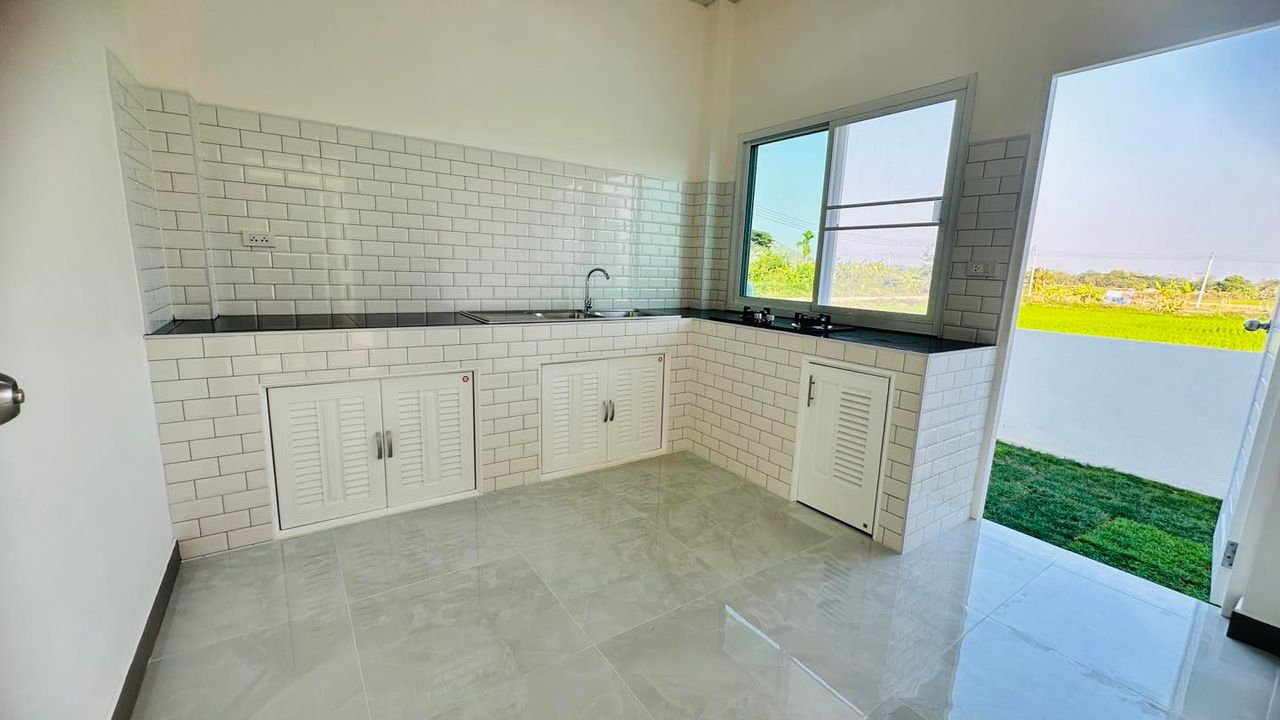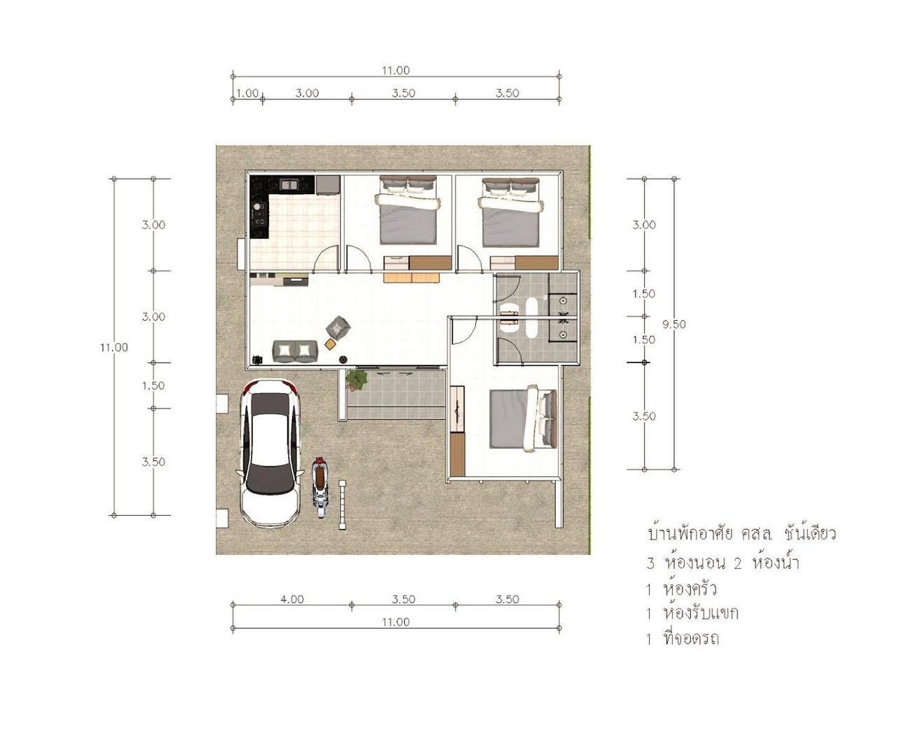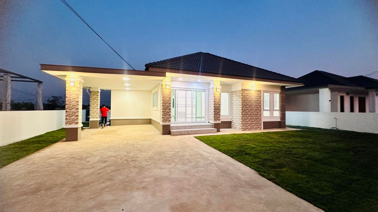 - ฟังก์ชันครบครัน: บ้านประกอบด้วย 3 ห้องนอน, 2 ห้องน้ำ, 1 ห้องรับแขก, 1 ห้องครัว, และ 1 โรงจอดรถ รองรับการใช้งานในครอบครัวขนาดกลางถึงใหญ่