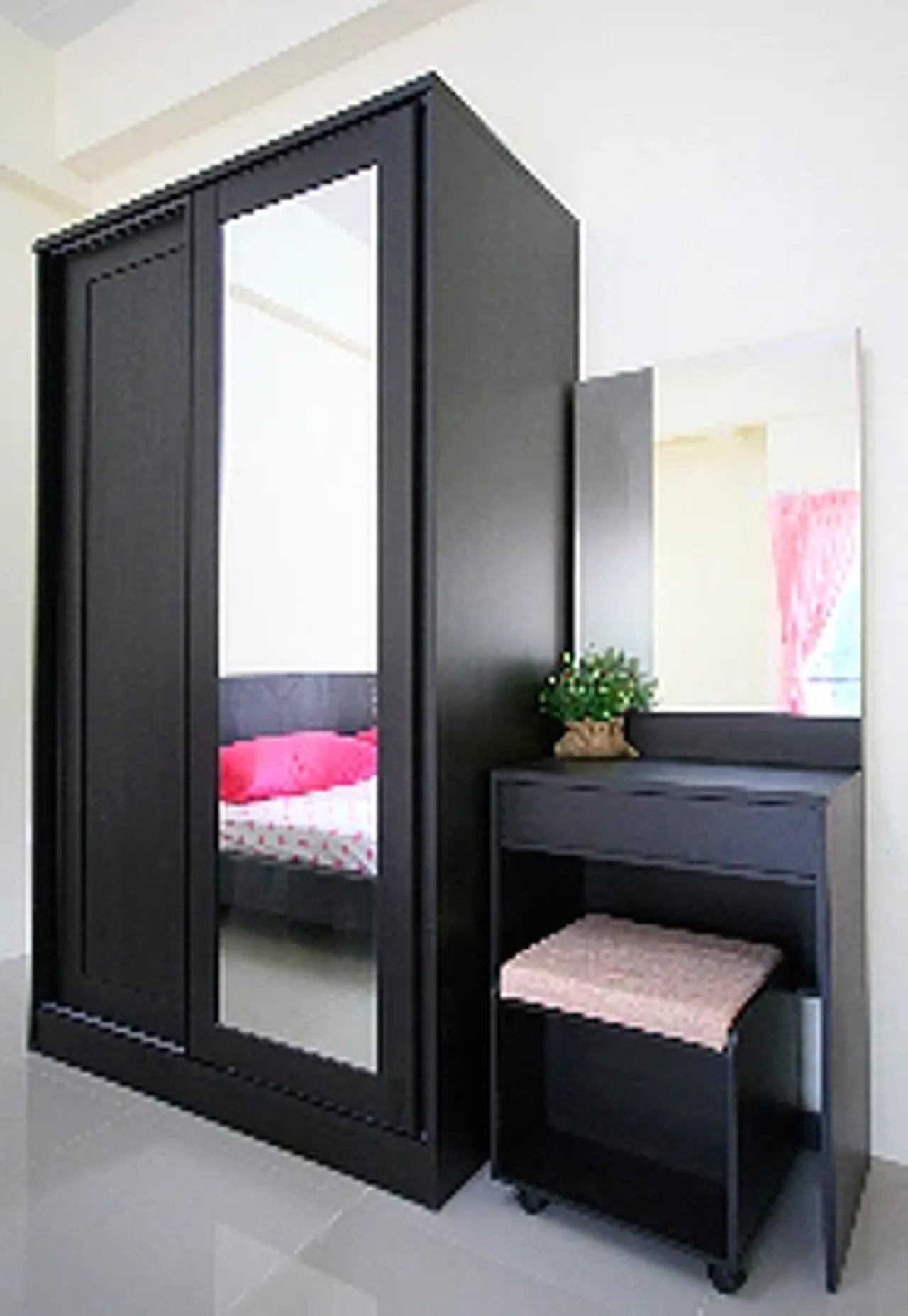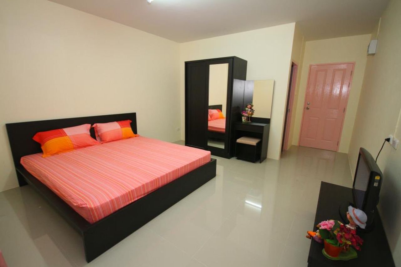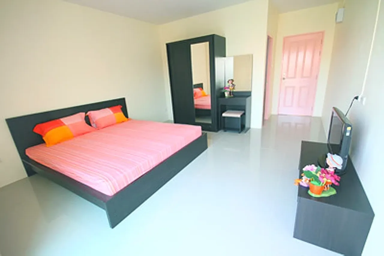 เฟอร์นิเจอร์แบบจัดเต็มทั้งเตียง 6 ฟุต ตู้เสือ้ผ้า โต๊ะเครื่องแป้ง ทีวีจอแบน พร้อมโต๊ะวางทีวี