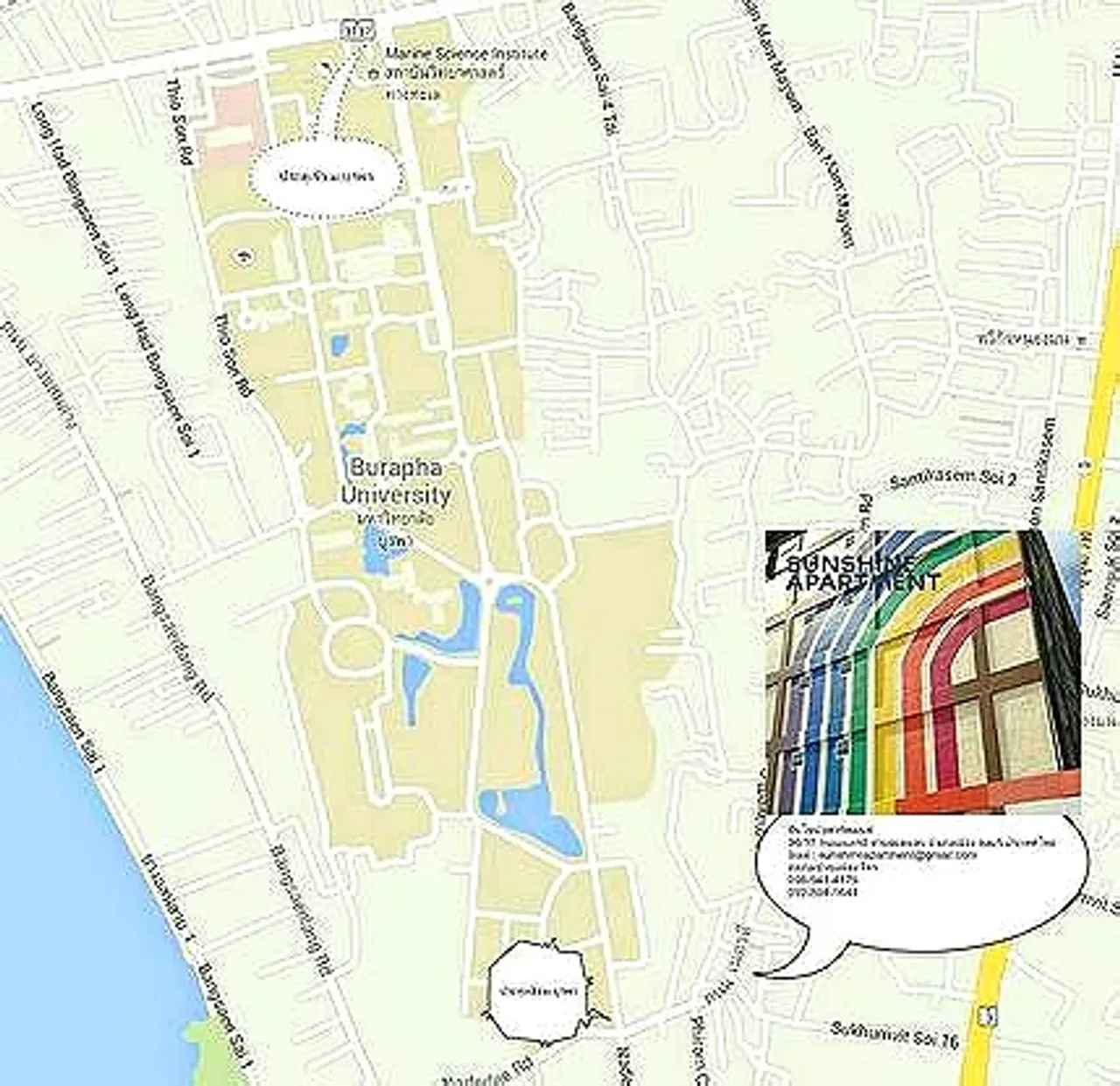 ซันชาย อพาร์เมนท์ เป็นอาคารห้องพักตั้งอยู่ด้านหลังมหาวิทยาลัยบูรพา ห่างจากประตูหลังมหาวิทยาลัยเพียง 100 เมตร และอยู่ฝั่งเดียวกับมหาลัย ไม่ต้องผ่านถนนใหญ่หรือข้ามถนน จึงมีความสะดวกและปลอดภัยในการเดินทางเป็นอย่างมาก
