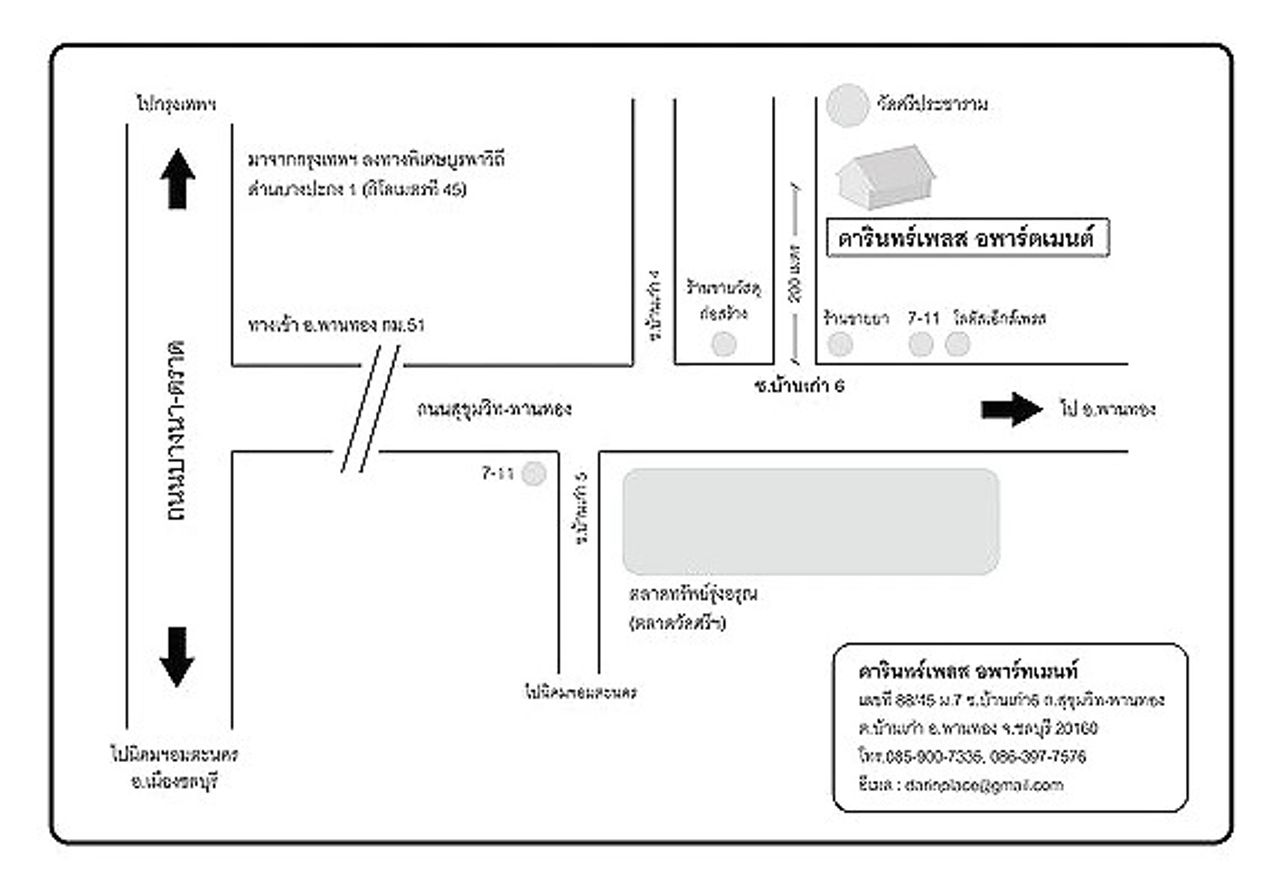 การเดินทางลงจากทางยกระดับบางนา-ตราดที่ทางออก45 บางปะกง-ฉะเชิงเทรา เลยโรงไฟฟ้าบางปะกงเล็กน้อย จากถนนบางนา-ตราด เลี้ยวซ้ายเข้า อ.พานทอง ถนน สุขุมวิท-พานทอง ตรงไปเรื่อยๆ เลี้ยวซ้ายเข้า ซอยบ้านเก่า 6 (วัดศรีประชาราม) โดยซอยจะอยู่ตรงข้ามตลาดสดทรัพย์รุ่งอรุณ หน้าปากซอยเป็นร้านขายยา มีเซเว่นอีเลฟเว่น โลตัสเอ็กซ์เพรส