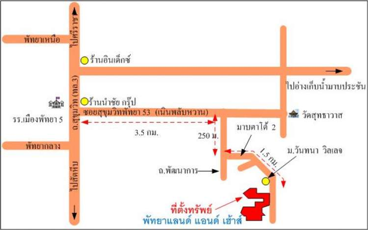 ที่ตั้ง : โครงการ พัทยาแลนด์ แอนด์ เฮ้าส์ ซอย 1/2 แยกจากถนนพัฒนาการ ถนน สุขุมวิท-พัทยา (เนินพลับหวาน) ตำบล หนองปรือ