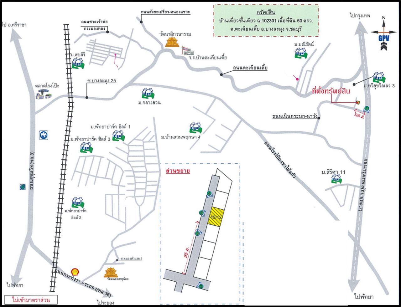 ที่ตั้ง : บ้านเดี่ยวชั้นเดี่ยว เลขที่ 45/12 หมู่ที่ 4 ตั้งอยู่ห่างถนนกรุงเทพ - พัทยา (ทล.7) 125 เมตร