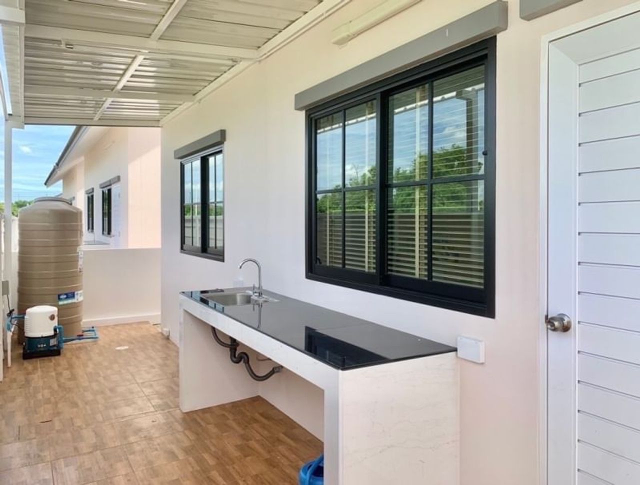 พื้นที่หลังบ้าน : มีเคาน์เตอร์ครัวยาว พร้อมซิ้งค์ล้างจาน กลิ่นอาหารไม่มารบกวนภายในบ้าน