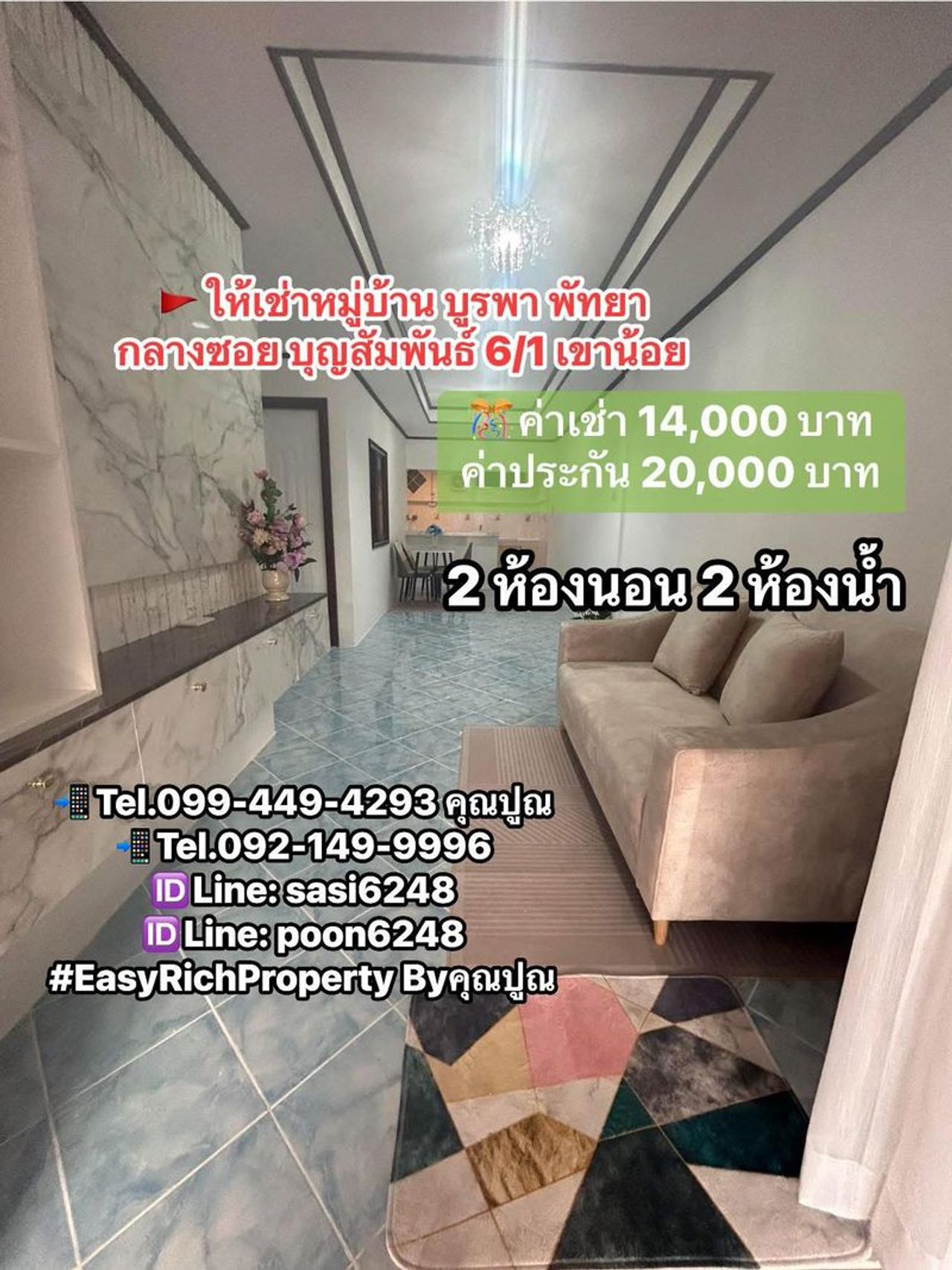 #ให้เช่าหมู่บ้านบูรพา1 พัทยากลางซอย บุญสัมพันธ์ 6/1 เขาน้อย เฟอร์นิเจอร์ครบ ค่าเช่า 14,000 บาท