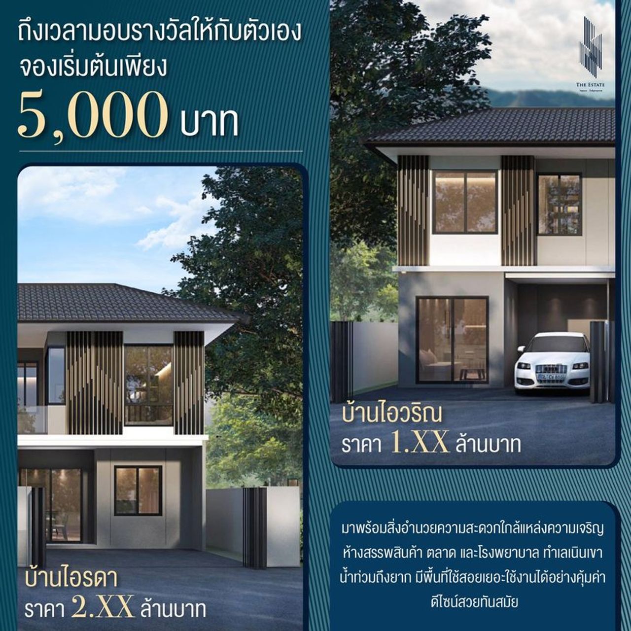 พิเศษ !! จองเริ่มต้นเพียง 5,000 บาทเท่านั้น เพียงเท่านี้คุณก็สามารถเป็นเจ้าของบ้านได้ง่าย ๆ แล้ว กับรูปแบบบ้านทาวน์เฮ้าส์ 2 ขนาด