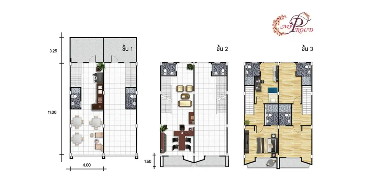 ตัวอาคารปูกระเบื้องพื้นทุกชั้น พร้อมห้องน้ำในแต่ละชั้น