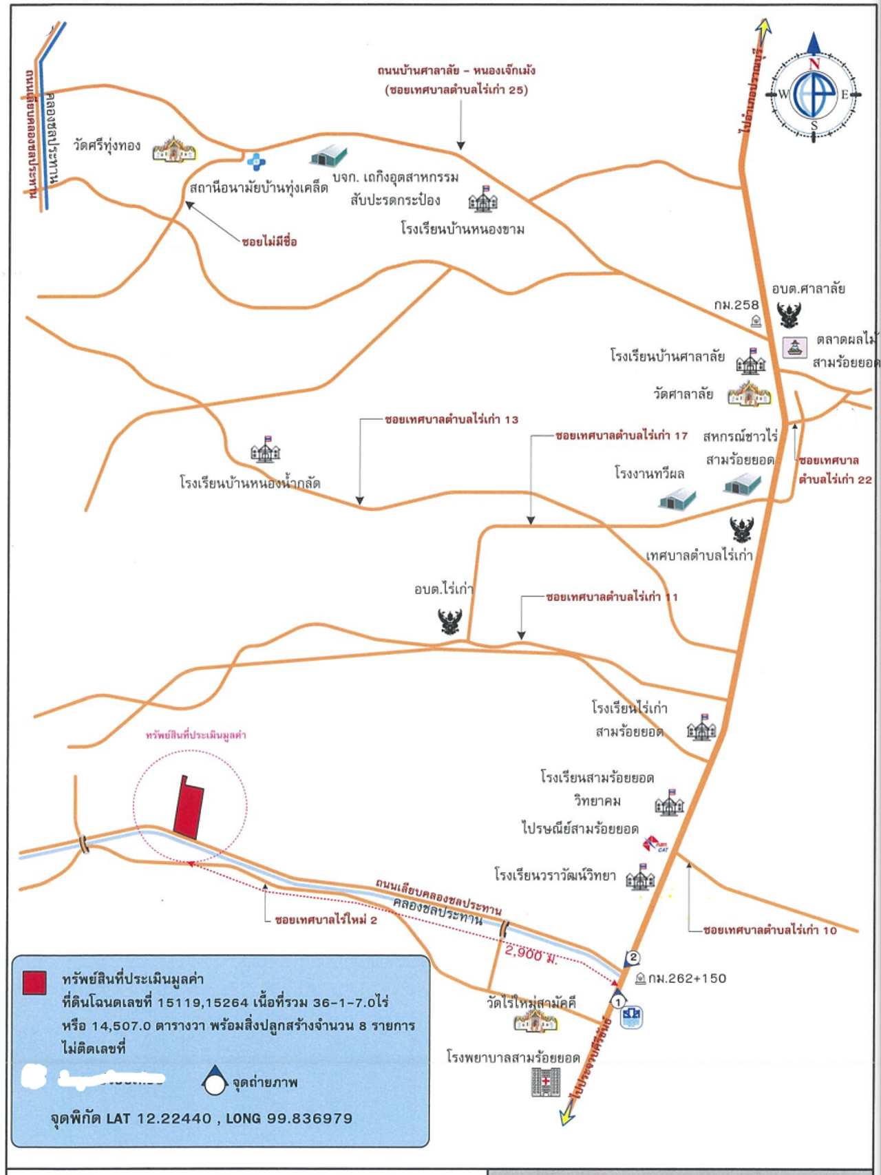 ที่ตั้ง : อยู่ติดถนนเลียบคลองชลประทาน โดยแยกจากถนนเพชรเกษม บริเวณ กม.262+200 เข้าถนนเลียบคลองชลประทาน 2.9 กม. ถึงที่ตั้งทรัพย์