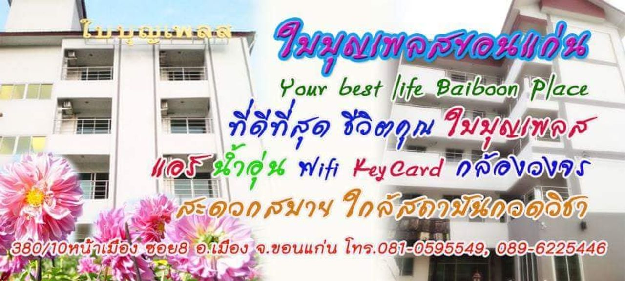 หอพักขอนแก่น ใบบุญเพลสขอนแก่น หอพักที่ดีที่สุด เครื่องปรับอากาศ น้ำอุ่น WiFi, Key Card และกล้องวงจรปิดสะดวกสบายใกล้สถาบันกวดวิชา 380/10 หน้าเมืองซอย 8 อำเภอเมือง จังหวัดขอนแก่น