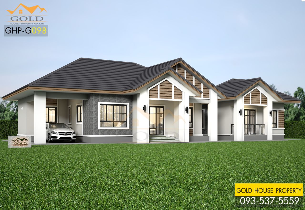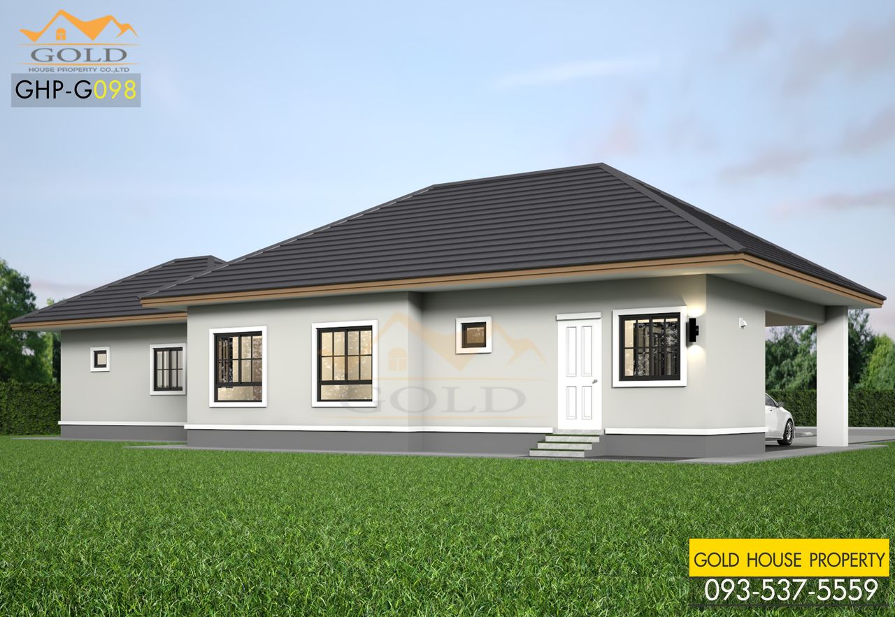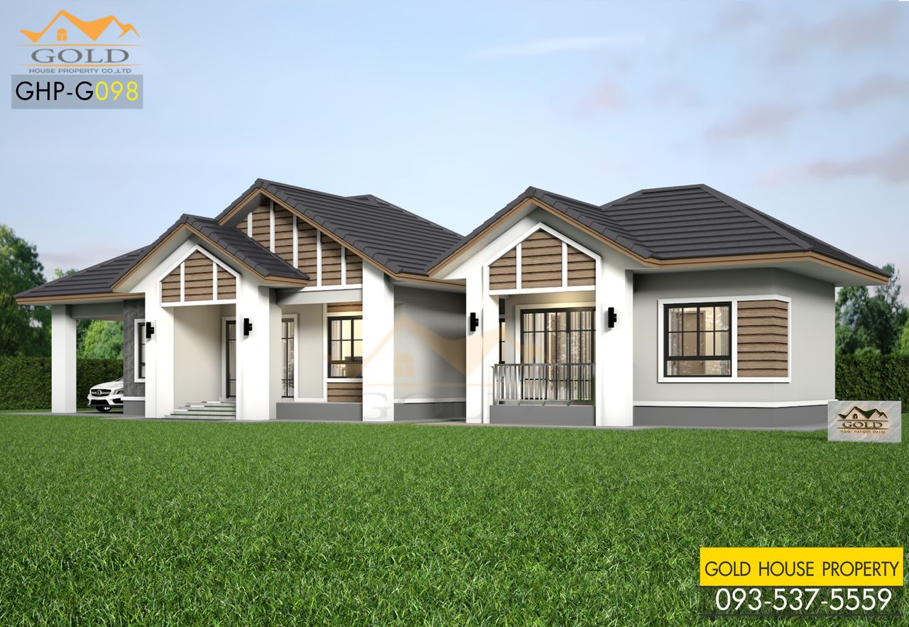 แบบบ้านสวย ๆ ชั้นเดียวทรงปั้นหยาผสมจั่ว สวยทันสมัย ดีไซน์สวยสุด ๆ เฉลียงหน้าบ้านกว้างใช้เป็นพื้นที่พักผ่อนเดินเล่นและยังสามารถทำเป็นที่นั่งเล่นรับลมหน้าบ้านชิล ๆ ได้อีกด้วย พร้อมกับภายในที่ลงตัว