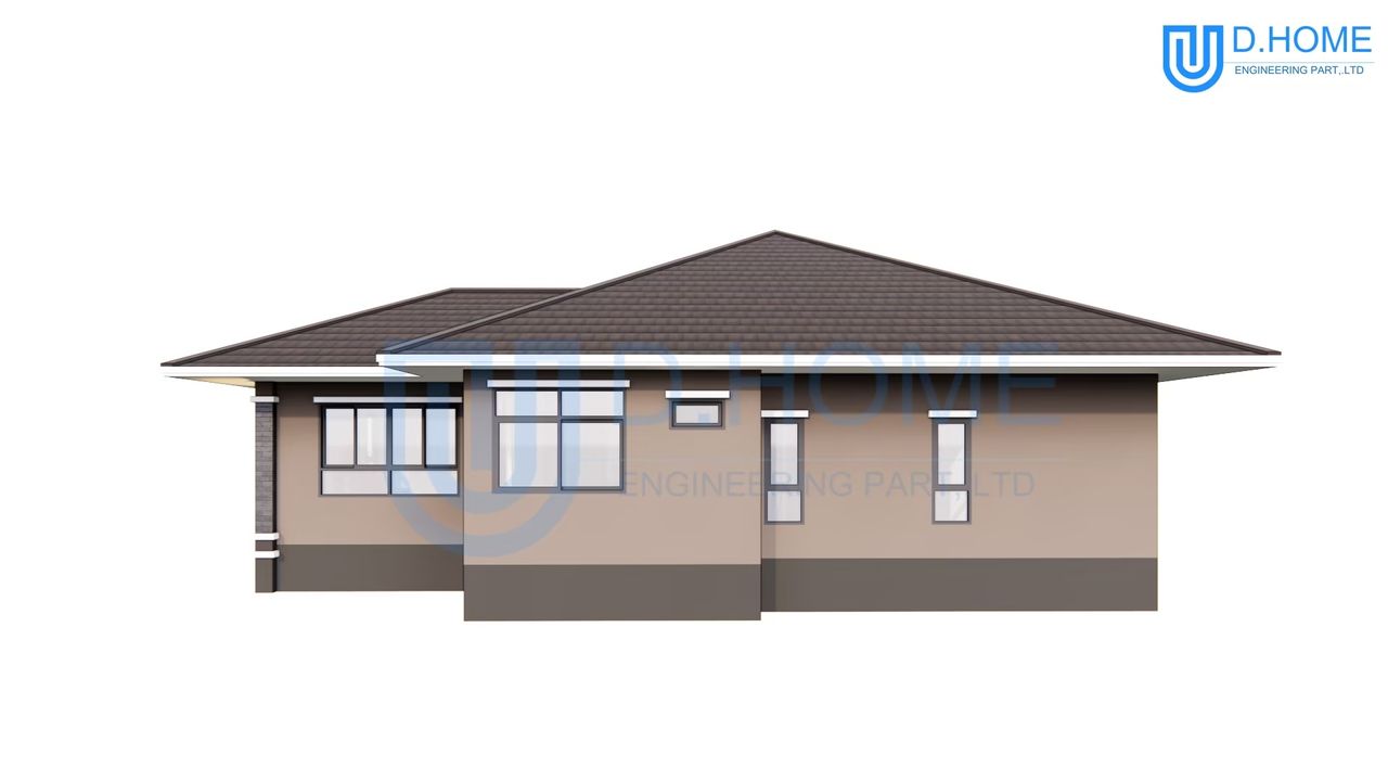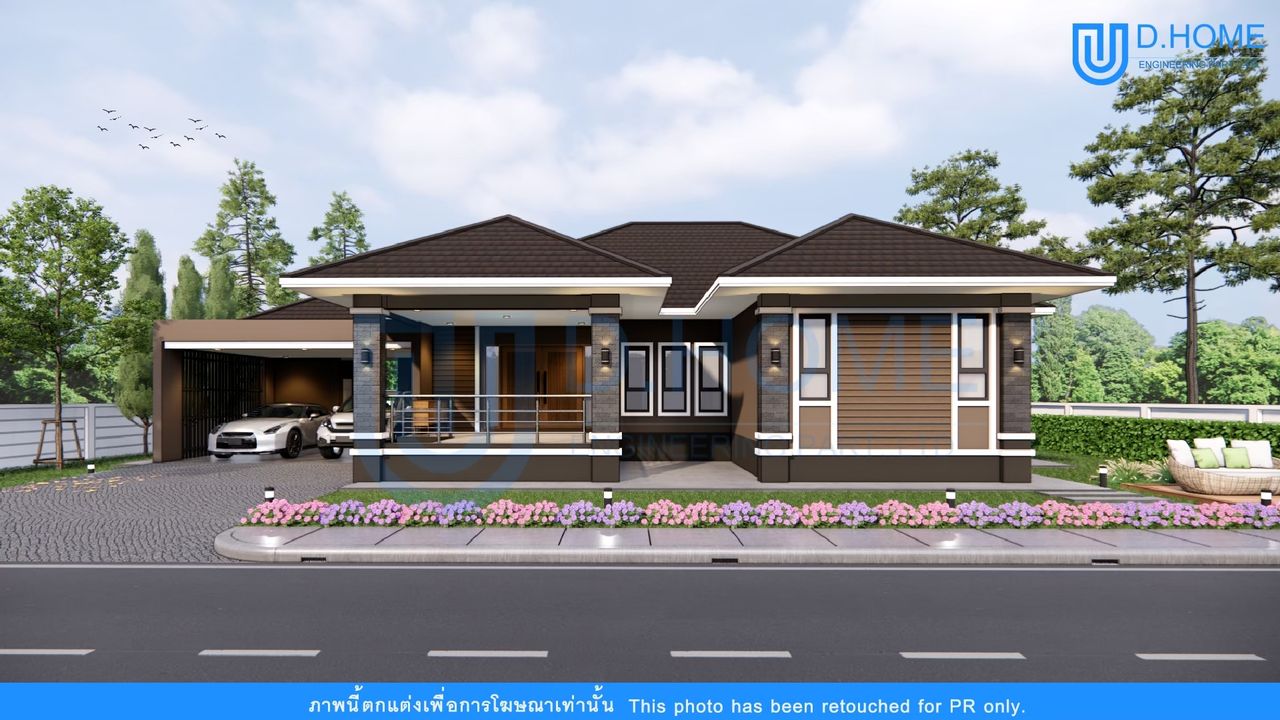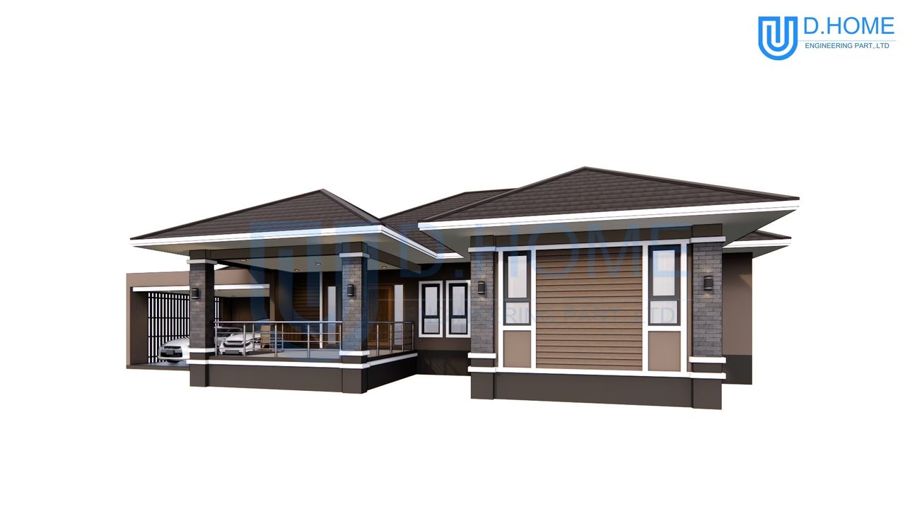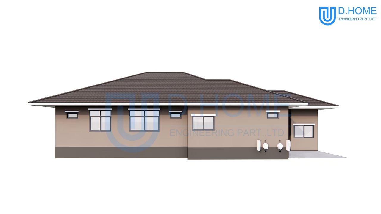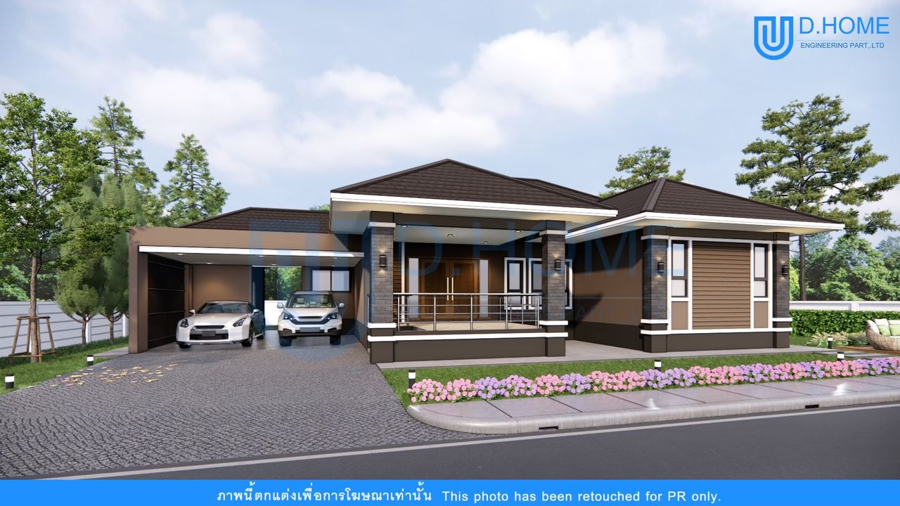 แบบบ้านพร้อมก่อสร้าง : บ้าน 1 ชั้น 3 ห้องนอน 4 ห้องน้ำ 1 ห้องรับแขก 1 ห้องครัว 2 ที่จอดรถ