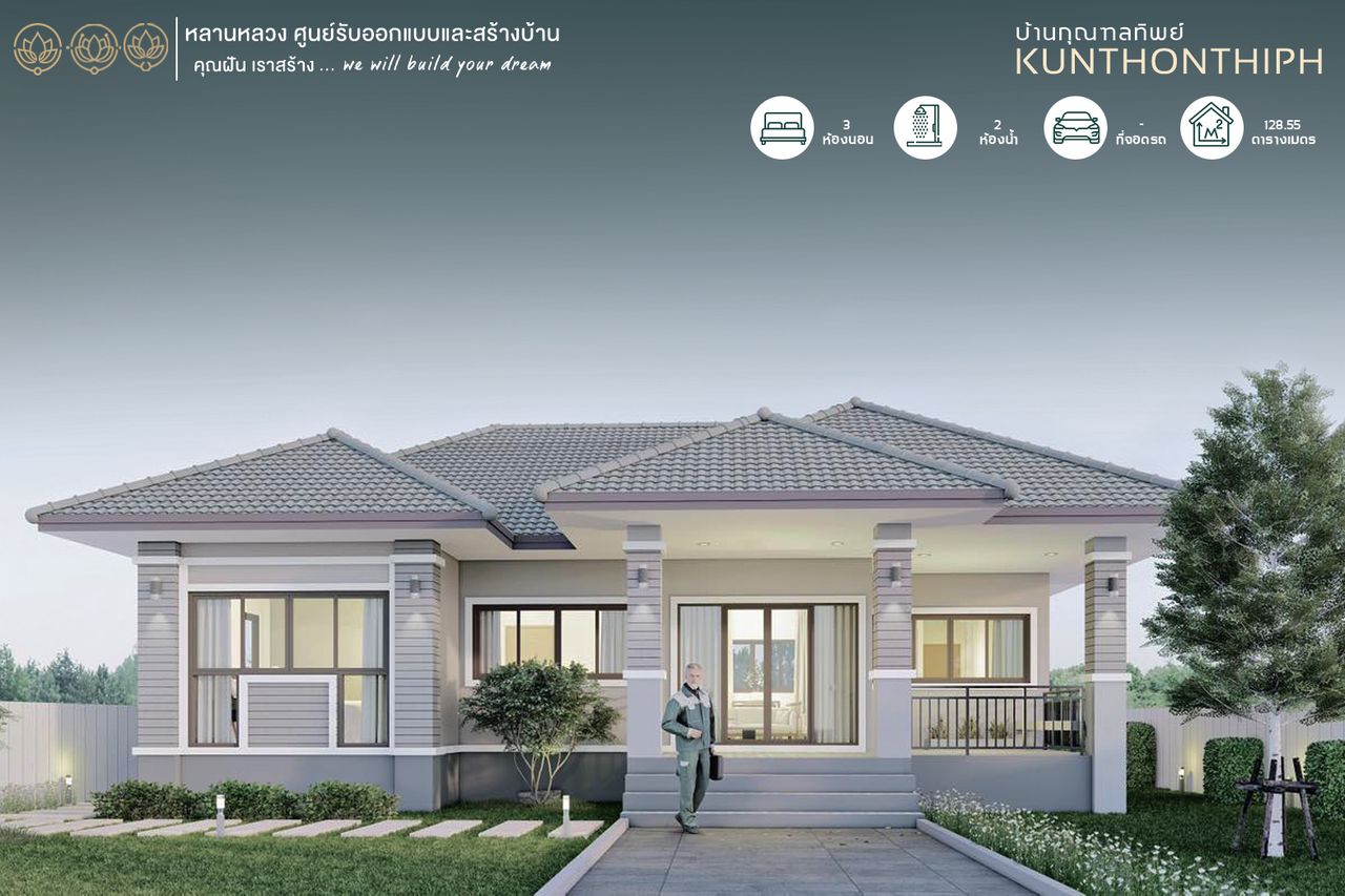 รับสร้างบ้านหลานหลวง บ้านชั้นเดียวสไตล์ คอนเทมโพรารี่ 3 ห้องนอน 2 ห้องน้ำ ชื่อแบบบ้านกุณฑลทิพย์