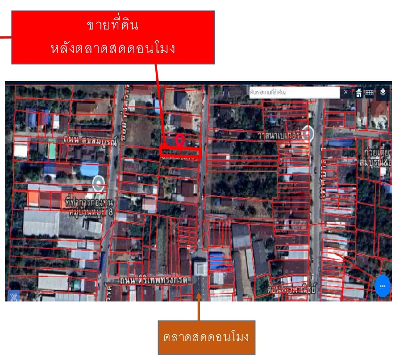 ขายที่ดิน หลังตลาดสดดอนโมง หน้ากว้าง 8ม. ลึก 42.5ม. เหมาะสำหรับหรับสร้างบ้านพัก อาศัย หรือเปิดร้านค้า หรือบ้านสวน อยู่ใกล้แหล่งอาหารการกิน อยู่ในแหล่งชุมชน โรงเรียน รพ.สต. ทำกิจการหรือพักผ่อนบ้านสวนก็สวกสบาย ไม่วุ่นวาย