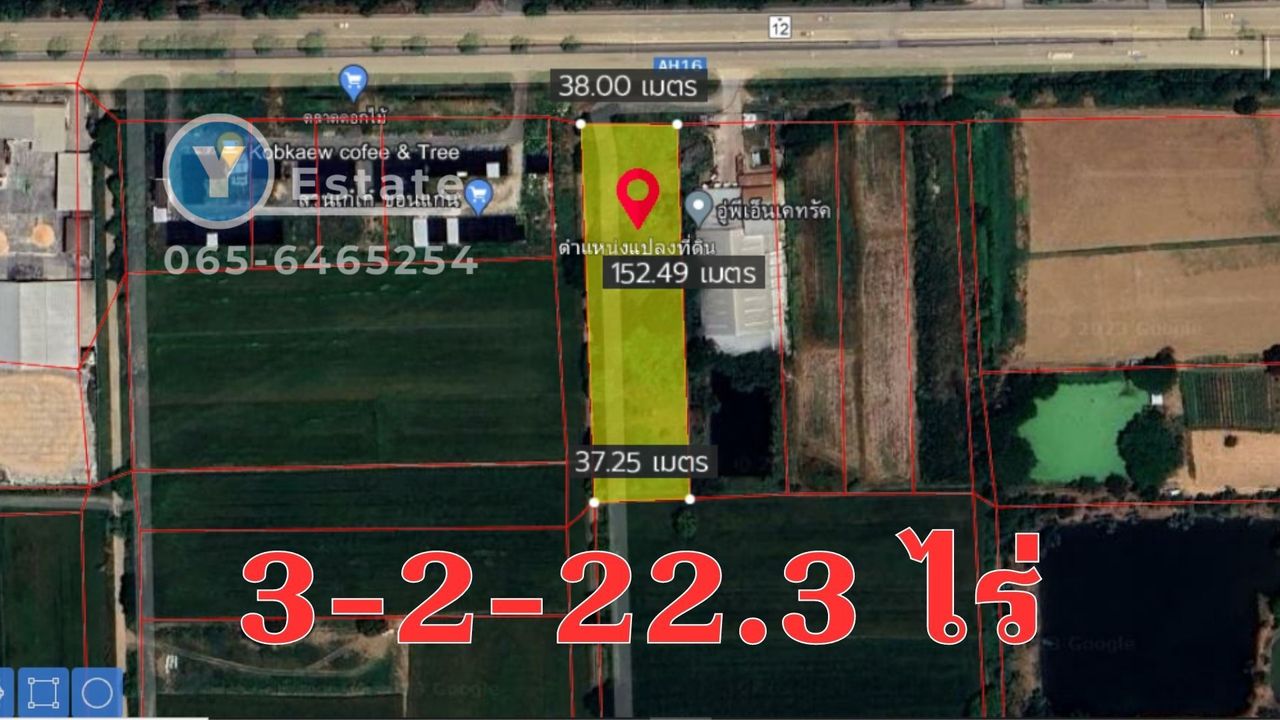 ขนาดแปลง 3ไร่ 2 งาน 22.3 วา หน้ากว้าง 38 ม. ลึก 150 ม.