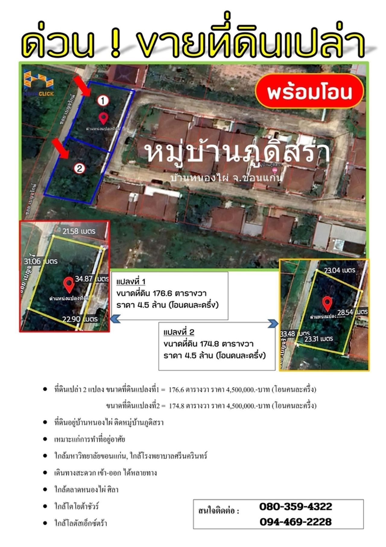 ขายที่ดินเปล่า 2 แปลง ติดหมู่บ้านภูดิสรา ศิลา - โกทา - หนองไผ่ - เมืองขอนแก่น - ศิลา