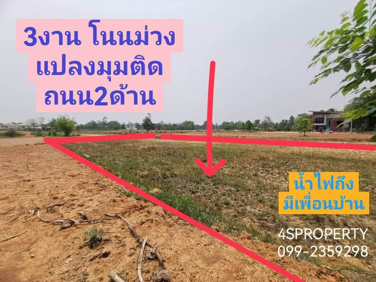 ที่ดินเปล่าบ้านโนนม่วง มข. เนื้อที่ 3งาน น้ำไม่ท่วม น้ำไฟถึง มีเพื่อนบ้าน แปลงสวยหัวมุม ติดถนน2ด้าน