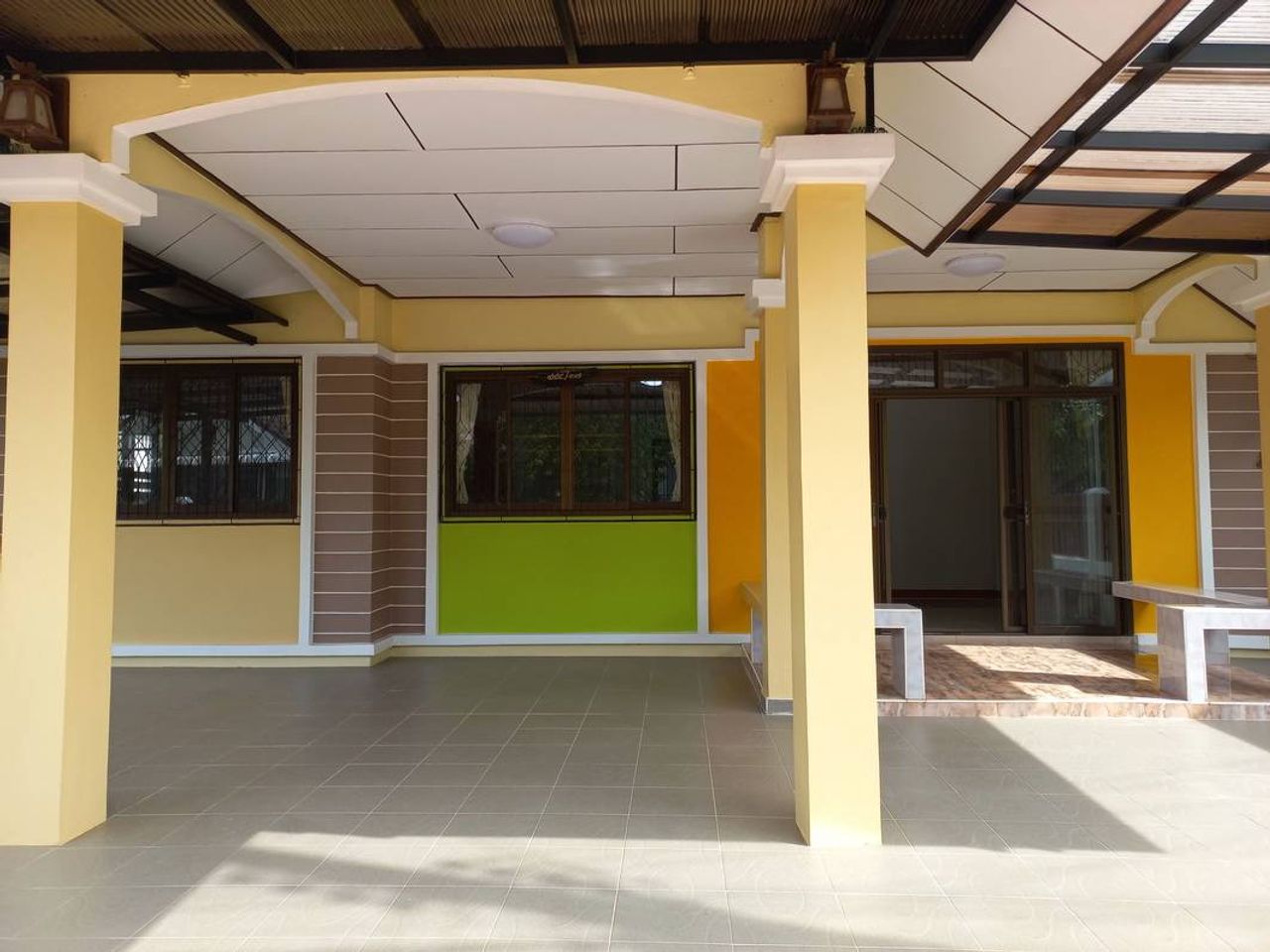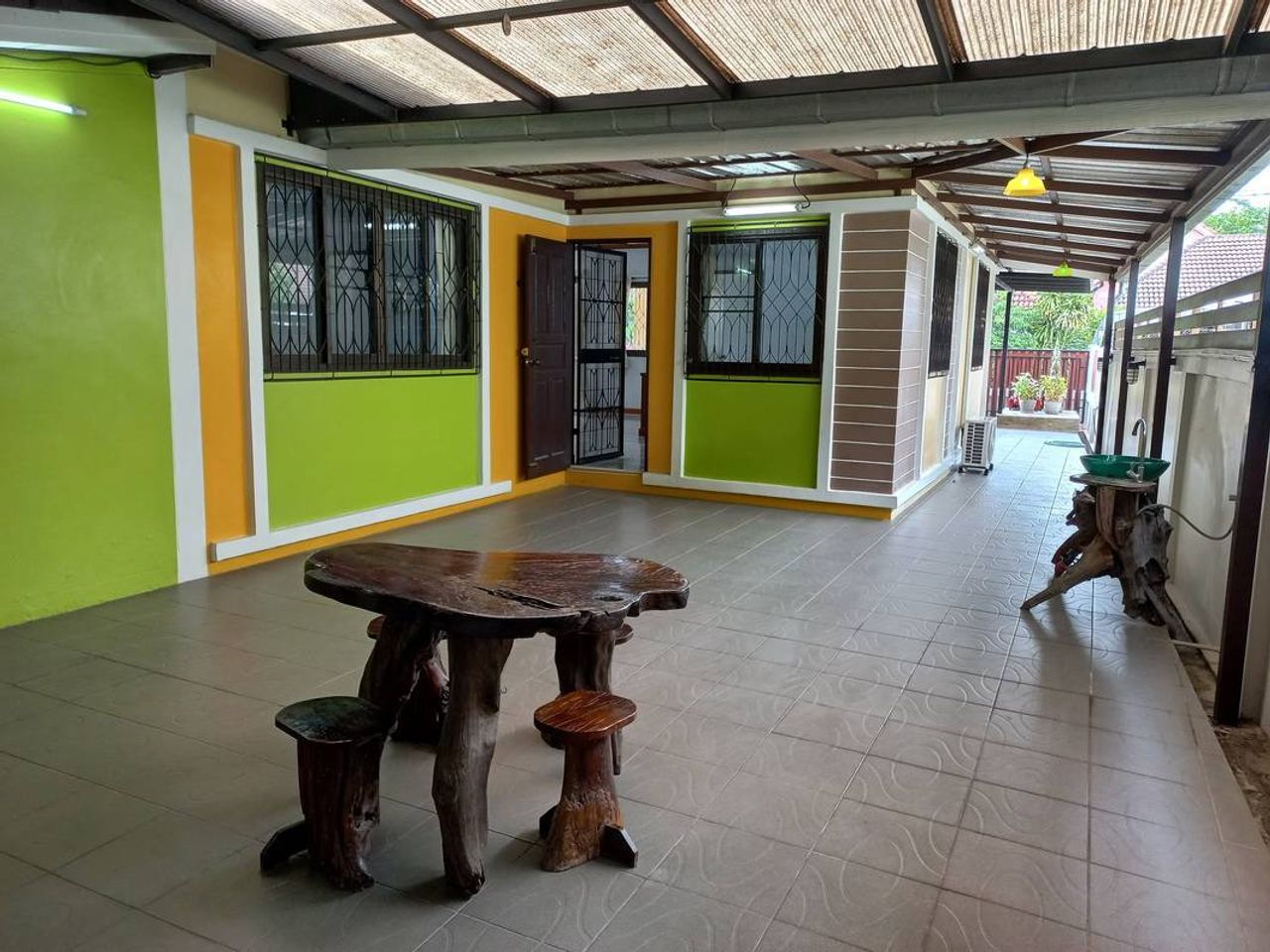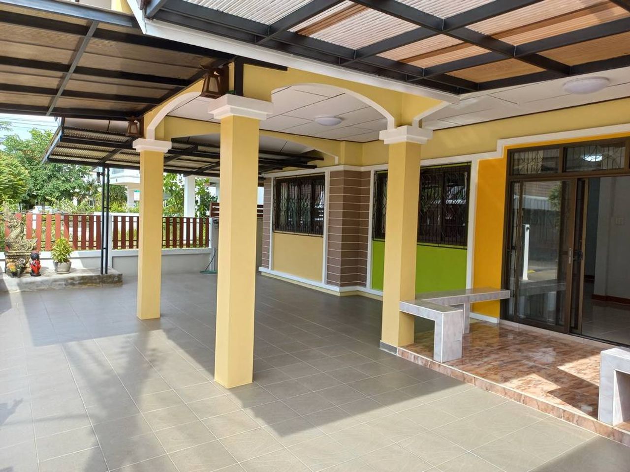 - บริเวณบ้านต่อเติมเต็มพื้นที่ โดยต่อเติมหลังคาและปูกระเบื้องรอบบ้าน ด้านหลังตกแต่งทำเป็นที่นั่งเล่น