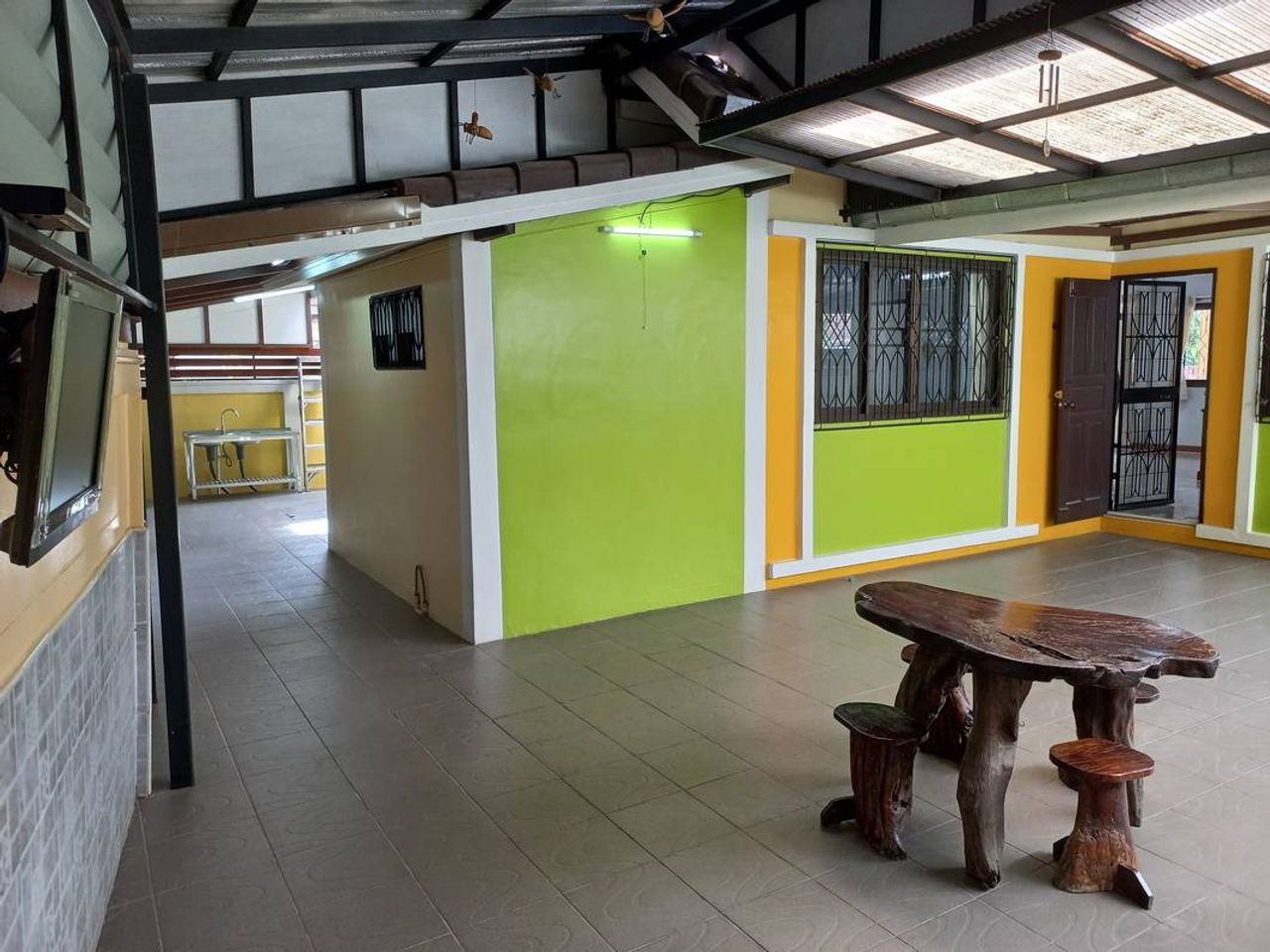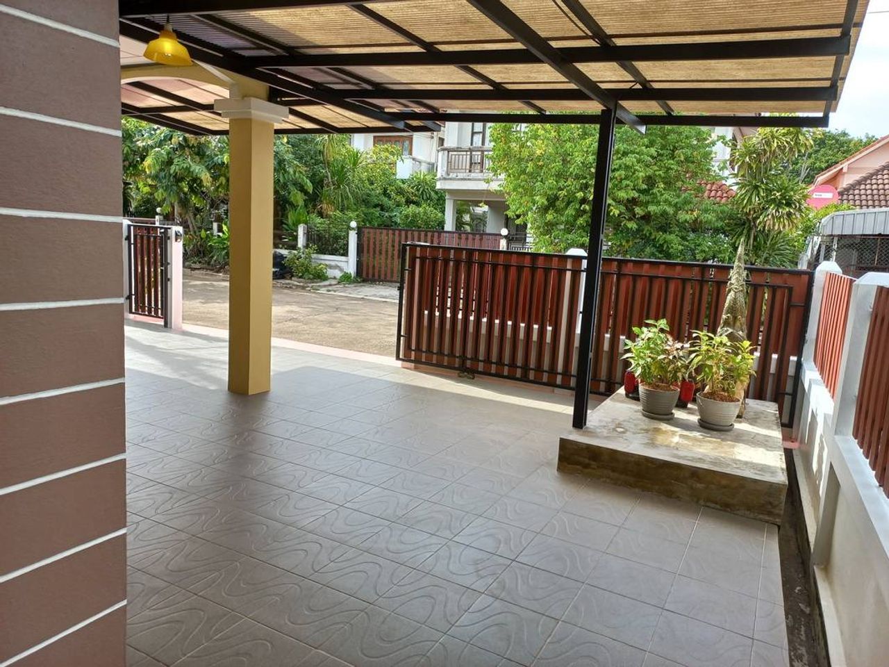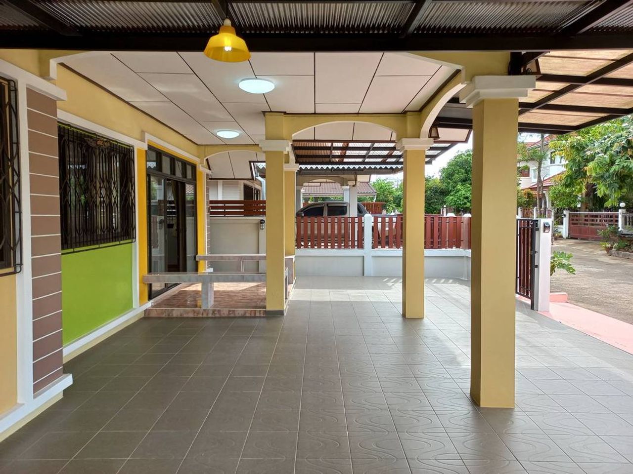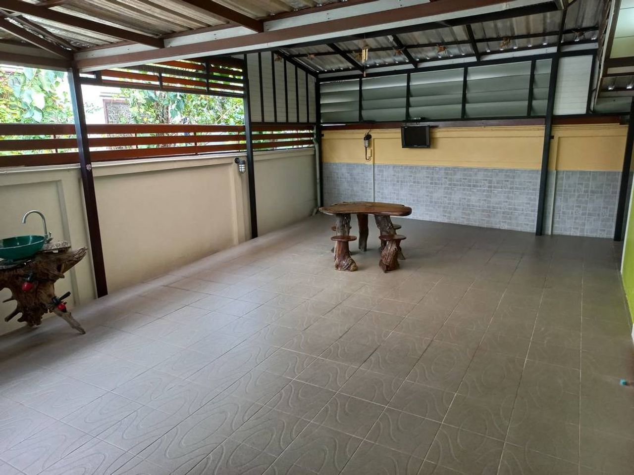 - บริเวณบ้านต่อเติมเต็มพื้นที่ โดยต่อเติมหลังคาและปูกระเบื้องรอบบ้าน ด้านหลังตกแต่งทำเป็นที่นั่งเล่น