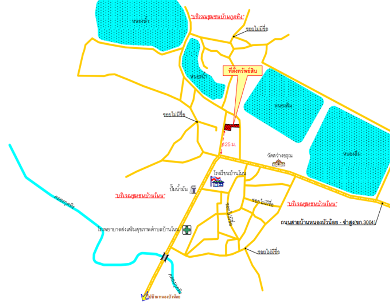ที่ตั้ง : ทรัพย์ตั้งอยู่ในซอยไม่มีชื่อ แยกจากถนน สายบ้านหนองบัวน้อย - ซำสูง ประมาณ 125 ม.