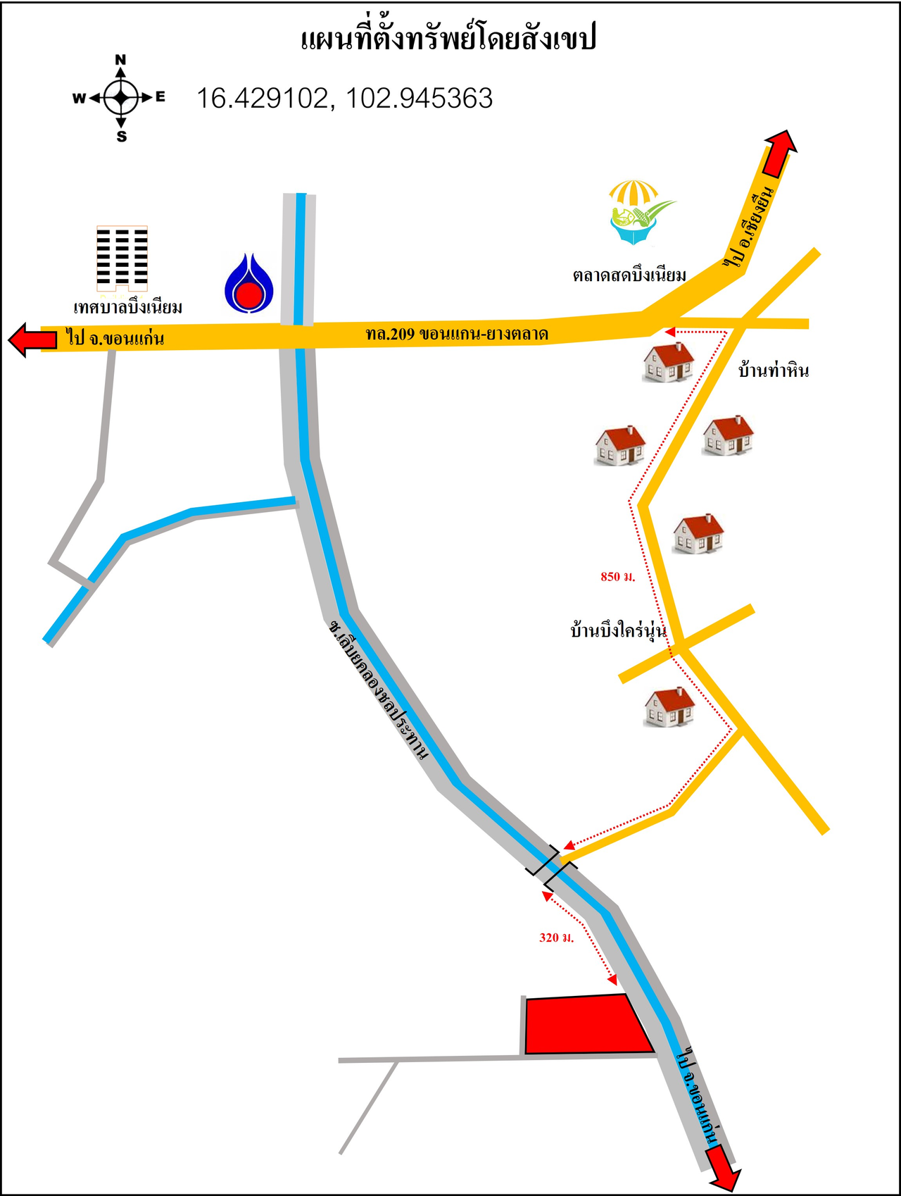 ที่ตั้ง : ห่างจากถนนสายขอนแก่น - ยางตลาด (ทล.12) ประมาณ 1.2 กม. เข้ามาทางบ้านบึงเนียม ทรัพย์ติดถนนเลียบคลองชลประทาน