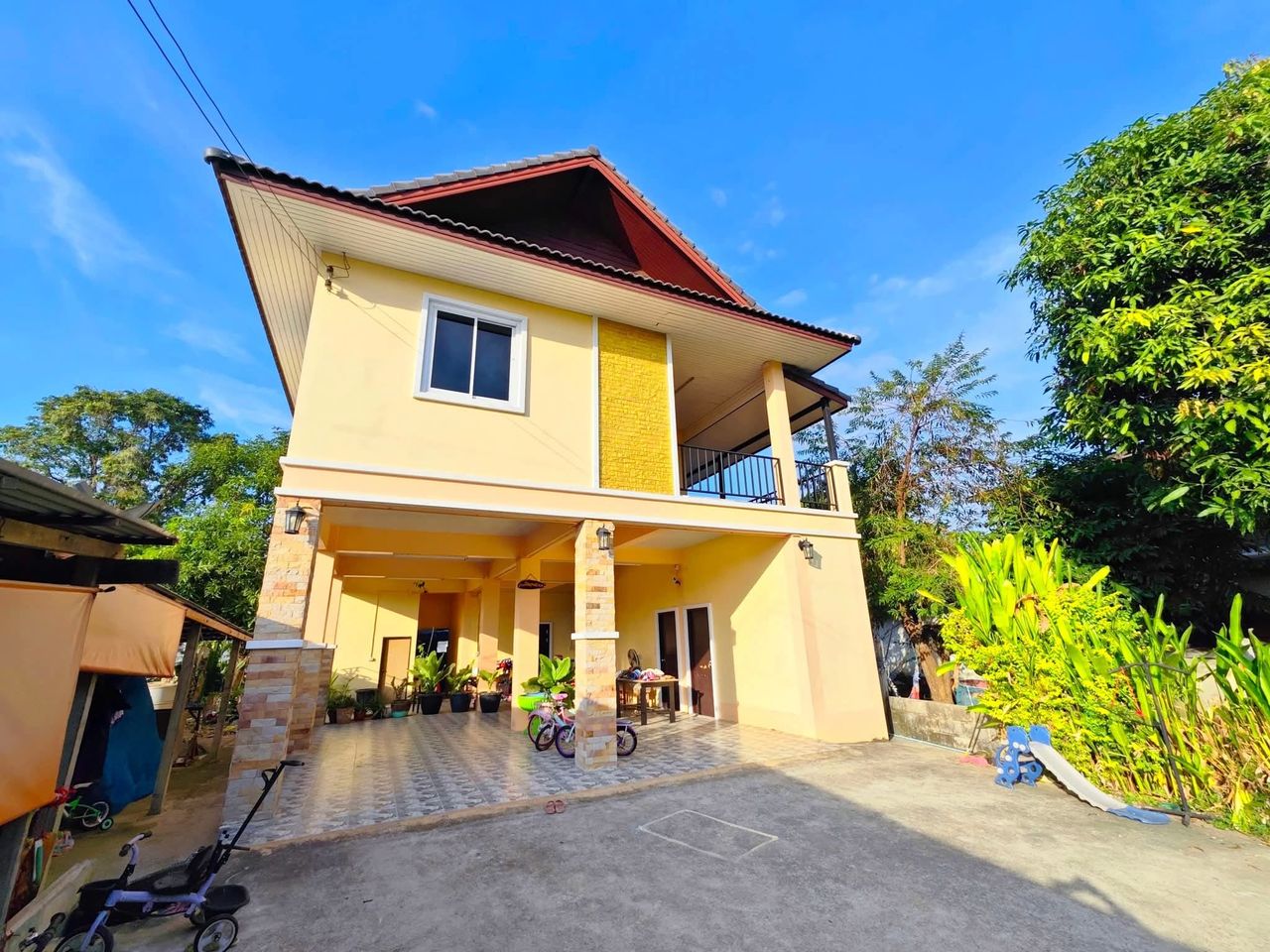 บ้านเดี่ยว 2 ชั้น ใต้ถุนสูง เย็นสบาย พร้อมระเบียงนั่งเล่นบนชั้น2 เนื้อที่ 67 ตร.ว. 3 ห้องนอน 3 ห้องน้ำ พร้อมห้องครัว ห้องคาราโอเกะ ห้องพระ ห้องแต่งตัว ห้องเก็บของ จอดรถยนต์ได้ 4-6 คัน แถมแอร์ใหม่ 3 เครื่อง คุ้มมากกกครับ