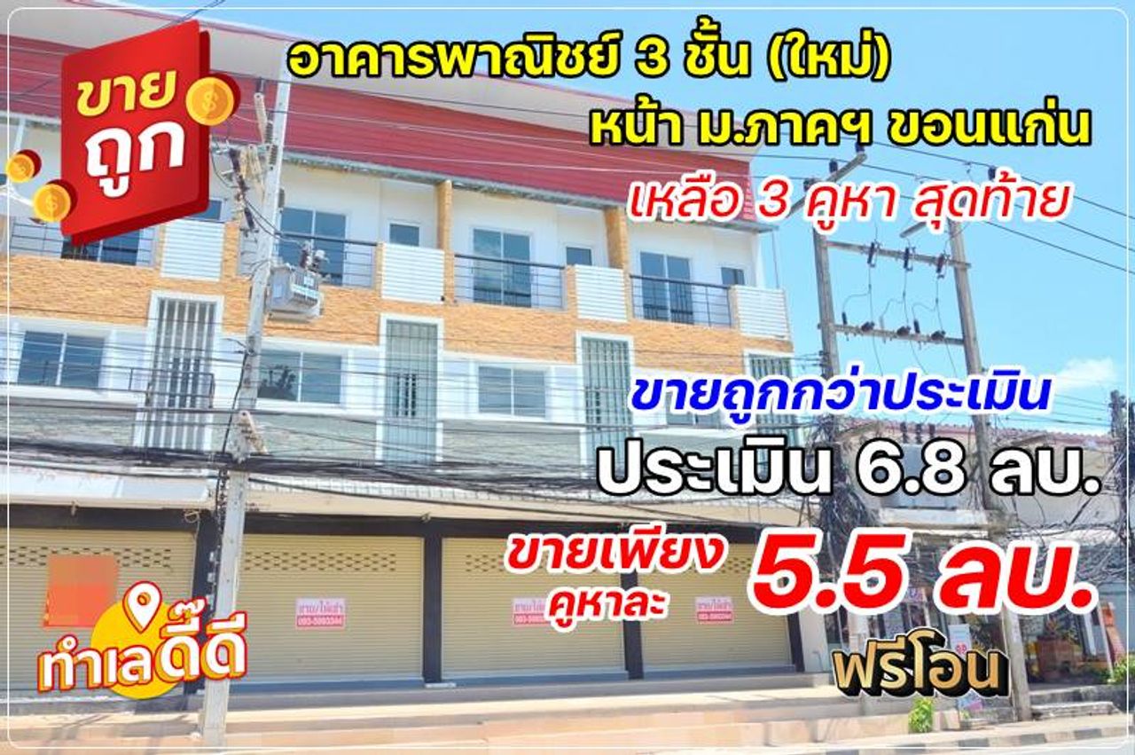 ขายถูกกว่าประเมิน อาคารพาณิชย์ 3 ชั้น ทำเลทอง ติดถนนบ้านกอก หน้า ม.ภาคฯ ขอนแก่น (เหลือ 3 คูหา สุดท้าย)