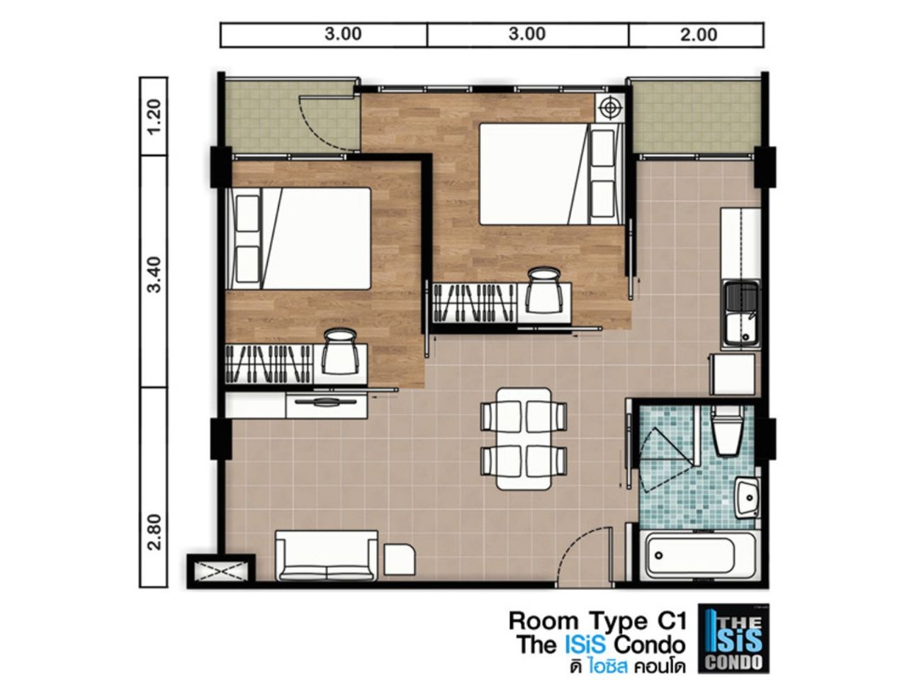 🛏 ชั้น7, 2ห้องนอน 1ห้องน้ำ, 59.32 ตารางเมตร