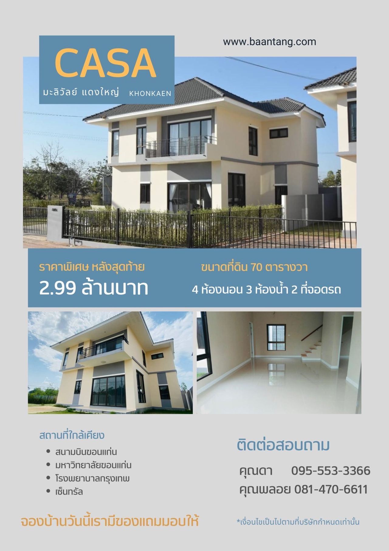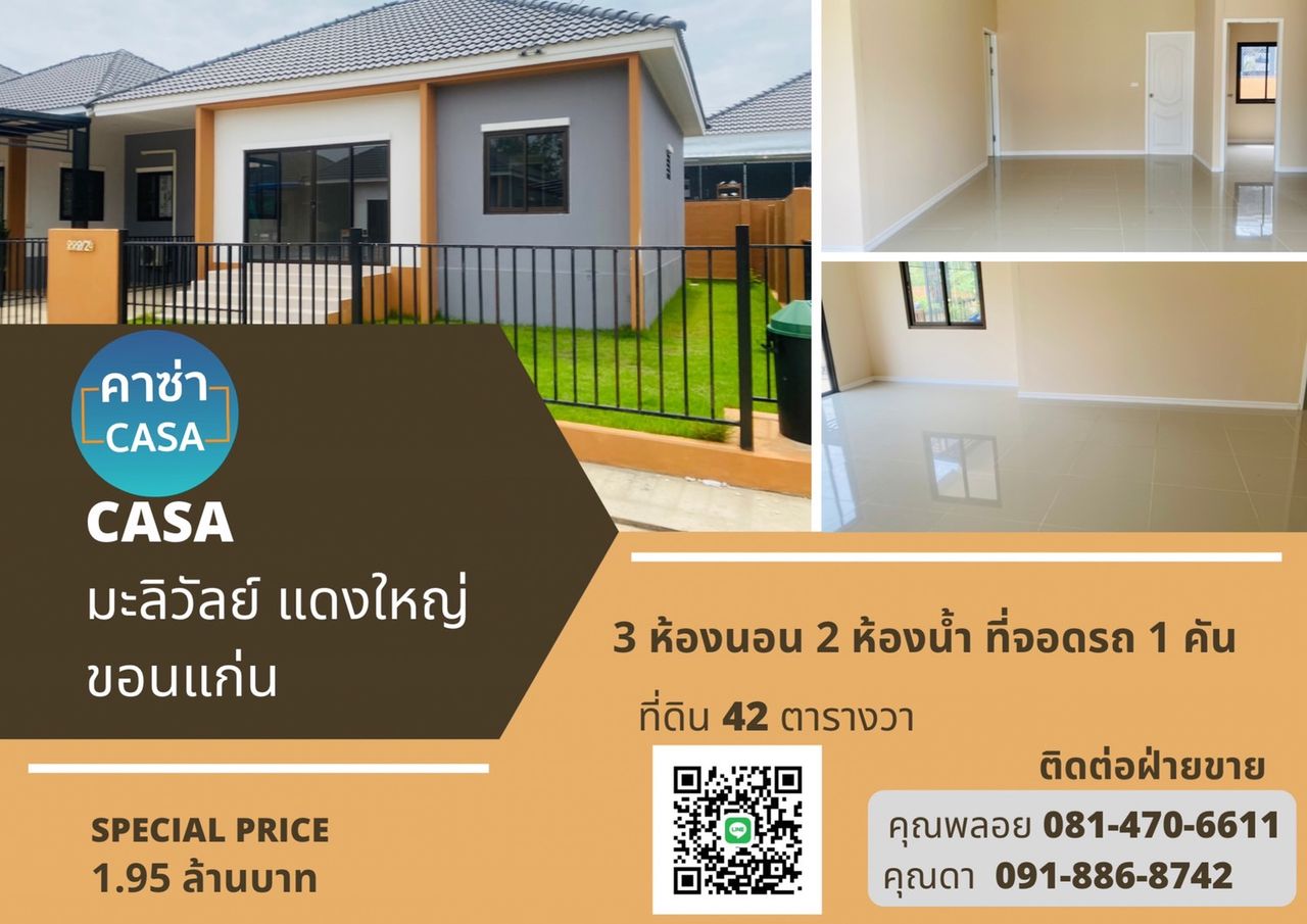 เปิดจองแล้ว โครงการบ้านขอนแก่น คาซ่า มะลิวัลย์ บ้าน 2 ชั้น 4 นอน 2 น้ำ เริ่มต้นที่ 1,990,000 บาท บ้าน 1 ชั้น 3 นอน 2 น้ำ เริ่มต้นที่ 1,650,000 บาท ทางเข้าสนามกอล์ฟแดนคูน โครงการห่างจากถนนมะลิวัลย์ 2 กม.(บ้านแดงใหญ่)ใกล้สนามบิน เข้าเมืองสะดวก ขายจริง สร้างจริง โอนจริง เข้าอยู่จริง จากประสบการณ์การสร้างบ้านขายมากกว่า30กว่าโครงการ *ด่วนราคานึ้เปิดจองถึงสิ้นเดือน มีนาคม 2563 เท่านั้น 095-5533366