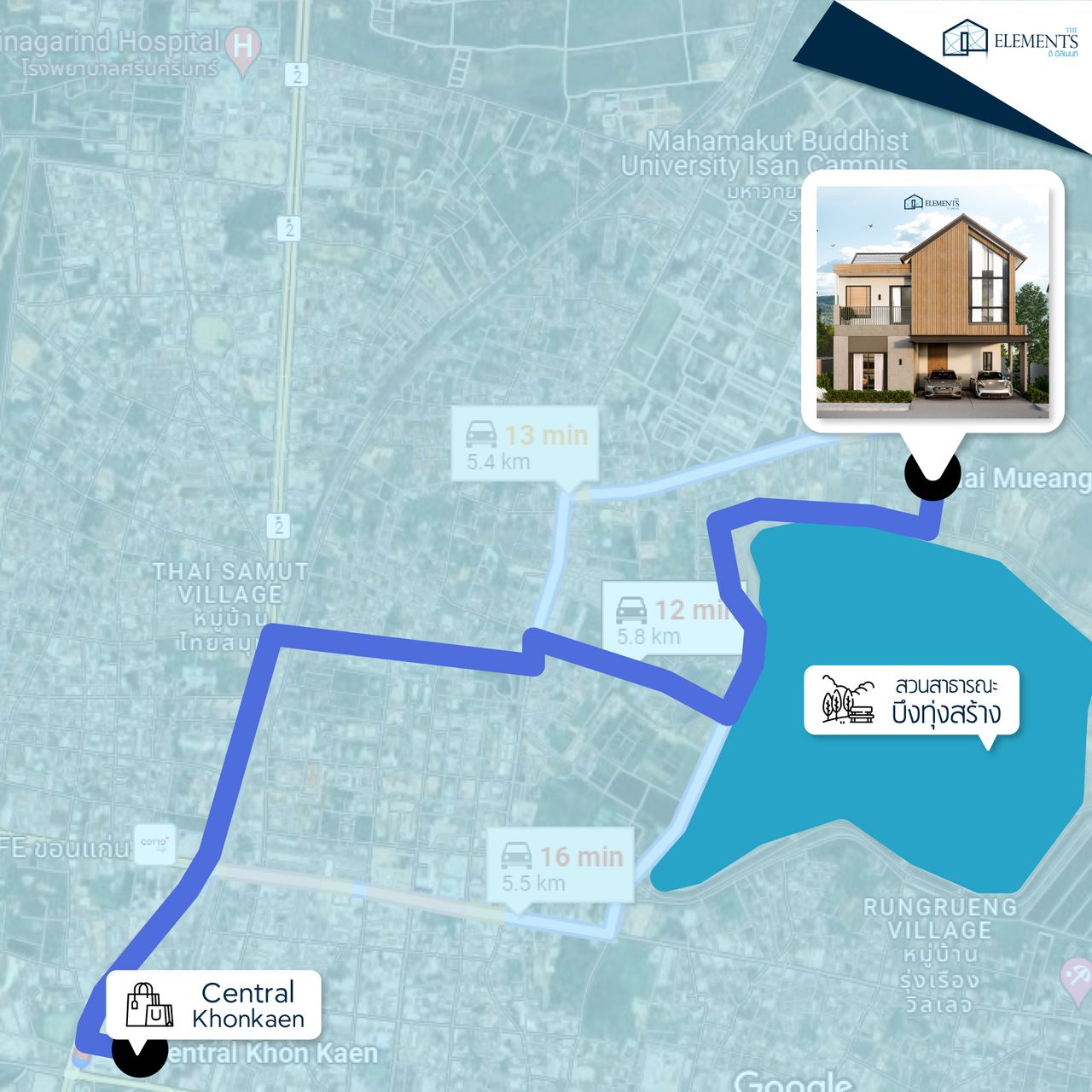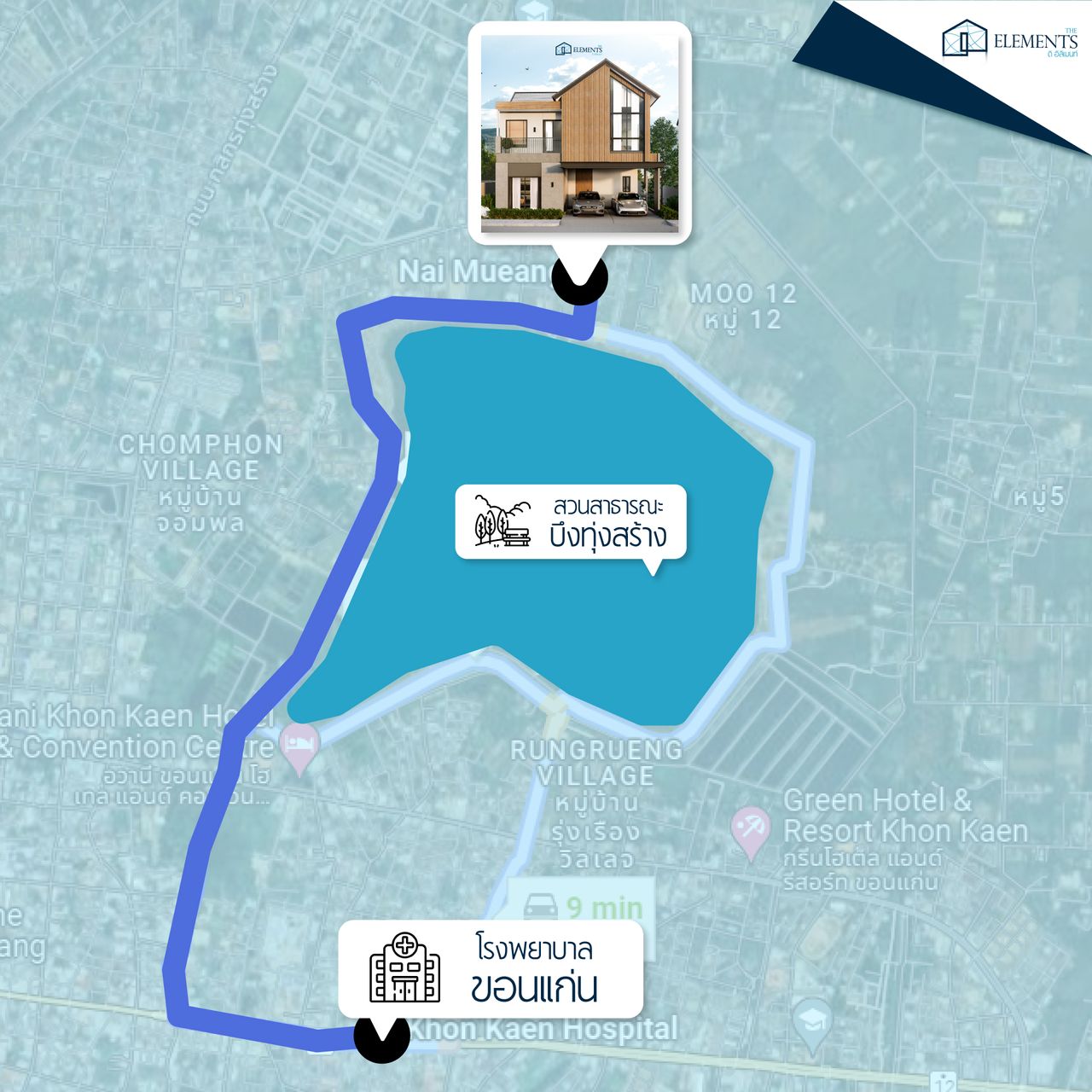 The Elements II บ้านเดี่ยว สไตล์ Minimal Tropical บรรยากาศที่รายล้อมไปด้วยสิ่งแวดล้อมธรรมชาติ ใจกลางเมืองขอนแก่น ติดบึงทุ่งสร้าง สวนสาธารณะ มีบึงขนาดใหญ่ ให้นั่งพักผ่อน พร้อมลู่วิ่ง และพื้นที่ปั่นจักรยานรอบบึง เดินทางง่าย ใกล้มหาวิทยาลัยขอนแก่น ห้างสรรพสินค้า และสิ่งอำนวยความสะดวกมากมาย