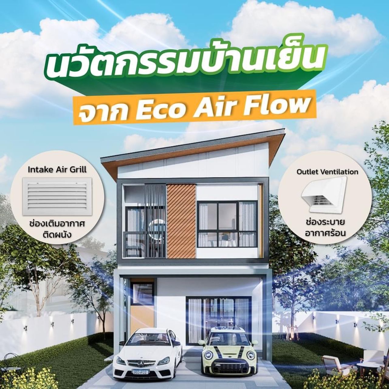 บ้านดีไซน์เพื่อผู้อยู่อาศัยทุกช่วงวัย เน้นความเรียบง่ายฟังก์ชั้นครบบ้านนวัฒกรรม ที่มีดีไซน์เพื่อผู้อยู่อาศัยทุกช่วงวัย มี1ห้องนอนชั้นล่างเพื่อผู้สูงอายุและให้ชั้นบนมี 3 ห้องนอน เพื่อความคุ้มค่าในราคาที่เท่าๆกันมีการนำInnovationเข้าใช้ในบ้านมาเพื่อความสะดวกสบายและประหยัดพลังงาน