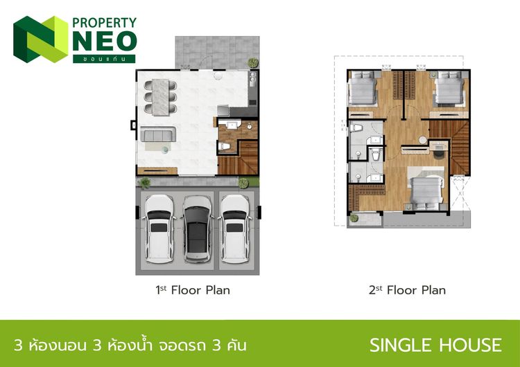 3 ห้องนอน 3 ห้องน้ำ จอดรถ 3 คัน พื้นที่ใช้สอย 160 ตร.ม.