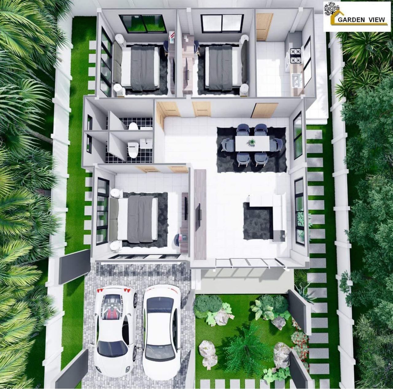 3 ห้องนอน 2 ห้องน้ำ 1 ห้องโถงที่ใหญ่มากๆ 1 ห้องครัว 2 ที่จอดรถกว้างๆ กันเลย