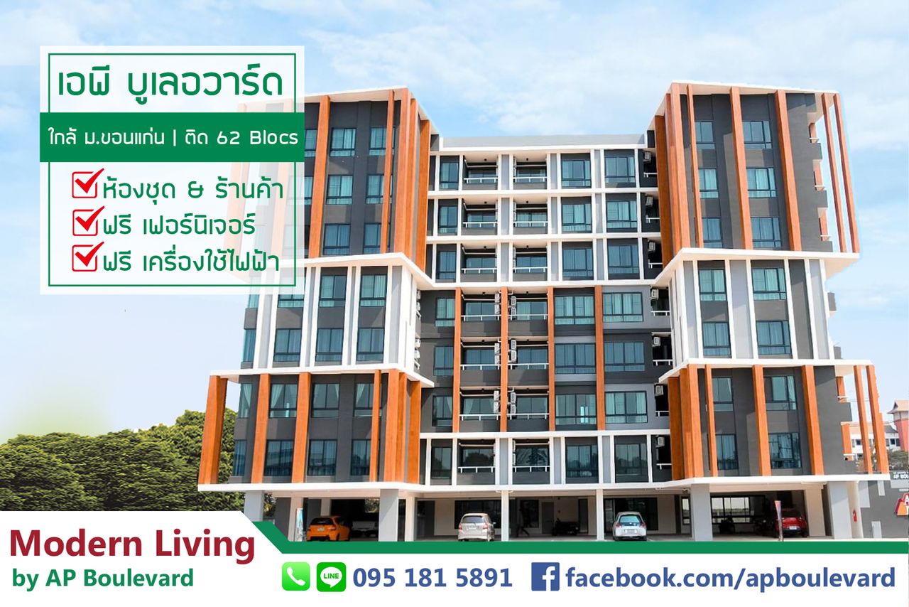 ความสุขที่จองได้@AP Boulevard Condo ทั้งห้องชุดและร้านค้าใต้คอนโด คอนโด Low Rise 8 ชั้น ใกล้ ม.ขอนแก่น ติดตลาด 62 Blocs ฝั่งกังสดาล จุดเริ่มต้นของความสะดวกสบาย ล้อมรอบด้วยสิ่งอำนวยความสะดวก ทั้งร้านค้า ร้านอาหาร มหาวิทยาลัย และโรงพยาบาล พร้อมระบบรักษาความปลอดภัย มีร้านซักรีด-ทำเล็บที่ชั้น 1