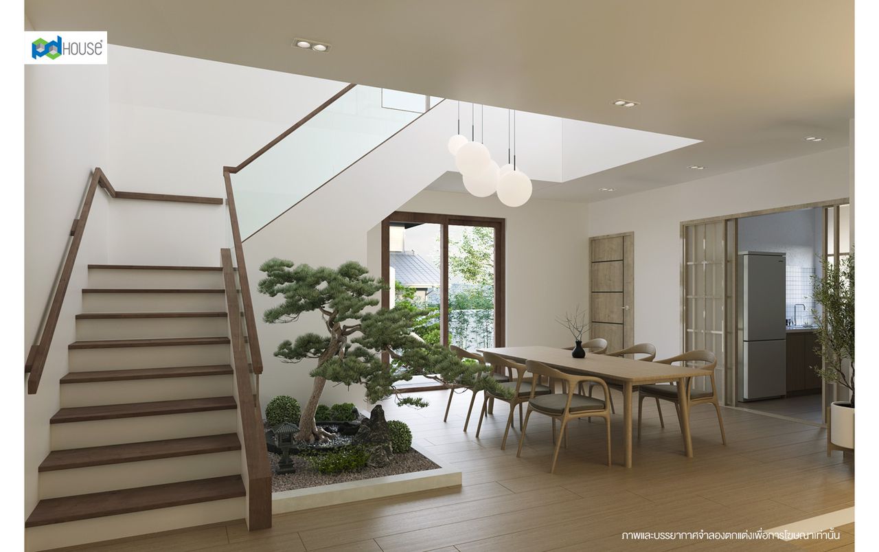 บ้าน 2 ชั้น ที่มีเอกลักษณ์แบบบ้านสไตล์ญี่ปุ่นดั้งเดิม ทั้งชายคายื่นยาว 1.50 เมตรพร้อมโซ่ระบายน้ำฝน เพิ่มกลิ่นอายความเป็นญี่ปุ่นด้วยไม้ฝาและไม้ระแนงตกแต่ง ผสมผสานความเป็นโมเดิร์นด้วยหลังคาคอนกรีตและกล่องเสาด้านหน้ากรุกระเบื้องเซรามิกเลียนแบบวัสดุธรรมชาติ มีระเบียงกระจกบริเวณด้านหน้า ทางลาดรองรับผู้สูงอายุเพื่อรองรับการอยู่อาศัยของทุกช่วงวัย ส่วนพื้นที่ใช้สอยภายในบ้านได้มีการแบ่งสัดส่วนการใช้งานระหว่างห้องพักผ่อน และห้องทานอาหารด้วยการเล่นระดับพื้น ที่ยังสามารถใช้งานรถเข็นได้ เพิ่มความพิเศษให้กับบ้านด้วย Double Volume หรือฝ้าสูงบริเวณพื้นที่ทานอาหารต่อเนื่องกับบันไดขึ้นชั้นบน เพื่อเพิ่มความรู้สึกโปร่งโล่งและสร้างปฏิสัมพันธ์กับผู้ใช้งานระหว่างชั้นล่างและชั้นบน ติดกับพื้นที่ทานอาหารได้ออกแบบเป็นสวนขนาดเล็กภายในบ้าน ช่วยสร้างความผ่อนคลาย และอาจทำให้พื้นที่ส่วนนี้เป็นศูนย์รวมของสมาชิกในครอบครัวได้เป็นอย่างดี
