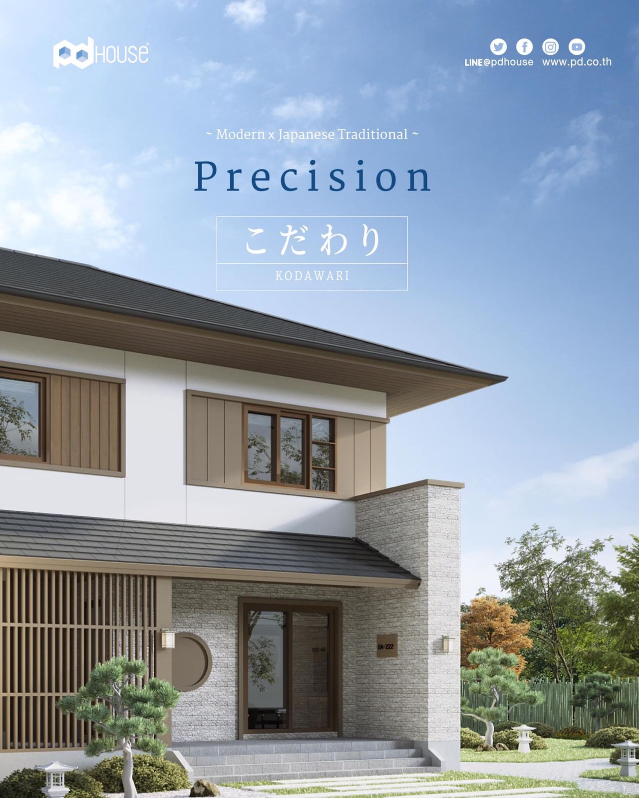 เป็นการผสมผสานระหว่างความโมเดิร์นและเอกลักษณ์บ้านญี่ปุ่น โดยผู้ออกแบบได้ยึดตามหลักปรัชญา “โคดาวาริ” ของญี่ปุ่นในการออกแบบอย่างพิถีพิถัน และใส่ใจทุกรายละเอียดของการออกแบบบ้านทั้ง 4 แบบ ตลอดจนคำนึงถึงวิถีชีวิตและการอยู่อาศัยที่สมบูรณ์แบบ รวมทั้งยังมีองค์ประกอบบ้านญี่ปุ่นที่มีความเฉพาะตัวในแต่ละแบบ ด้วยวัสดุตกแต่งเปลือกอาคารที่เป็นระแนงไม้และหินตกแต่งเลียนแบบธรรมชาติ ทำให้บ้านดูโดดเด่นอย่างมีเอกลักษณ์และมีรสนิยมของผู้เป็นเจ้าของบ้าน