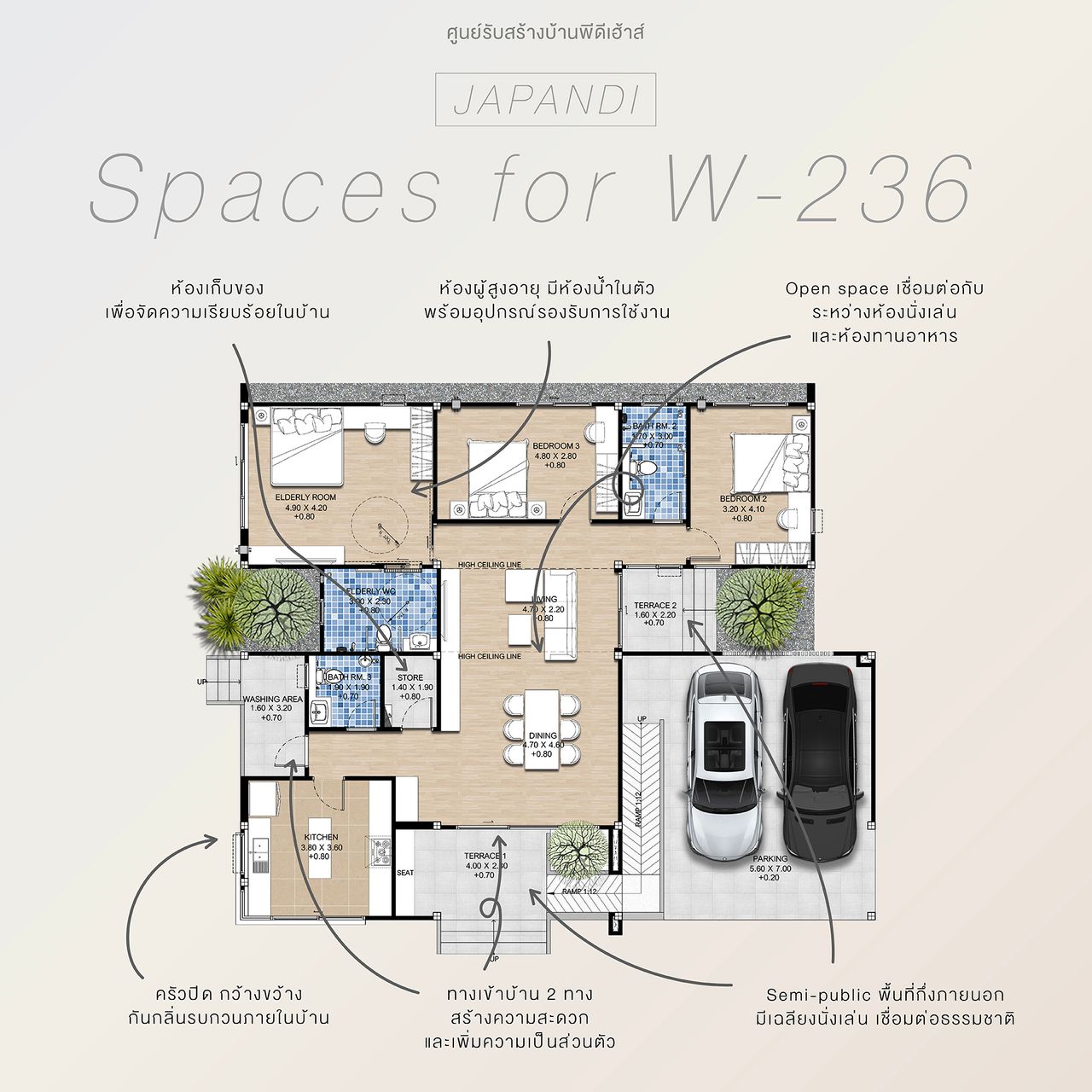 บ้านชั้นเดียวที่ผสมผสานงานสถาปัตยกรรมของญี่ปุ่นและสแกนดิเนเวียนไว้อย่างลงตัว โดดเด่นด้วยรูปทรงที่มีเอกลักษณ์ พร้อมเฉลียงด้านหน้าที่สามารถจัดเป็นมุมพักผ่อนได้ ตัวบ้านถูกออกแบบให้มีช่องเปิดขนาดใหญ่โดยรอบมองเห็นบรรยากาศภายนอกได้อย่างใกล้ชิด ภายในถูกออกแบบให้ดูเรียบง่ายในสไตล์ Minimal แต่แฝงไว้ด้วยความทันสมัยเพื่อให้สอดรับการการใช้งานในยุคปัจจุบัน คุ้มค่าด้วยการจัดวางพื้นที่ใช้สอยให้เชื่อมต่อกันพร้อมห้องนอนผู้สูงอายุที่มีห้องน้ำในตัวและอุปกรณ์รองรับการใช้งาน ภายในคุมโทนสีที่อ่อนเพื่อให้ดูอบอุ่นสบายตา ตอบรับการอยู่อาศัยได้อย่างสมบูรณ์แบบ