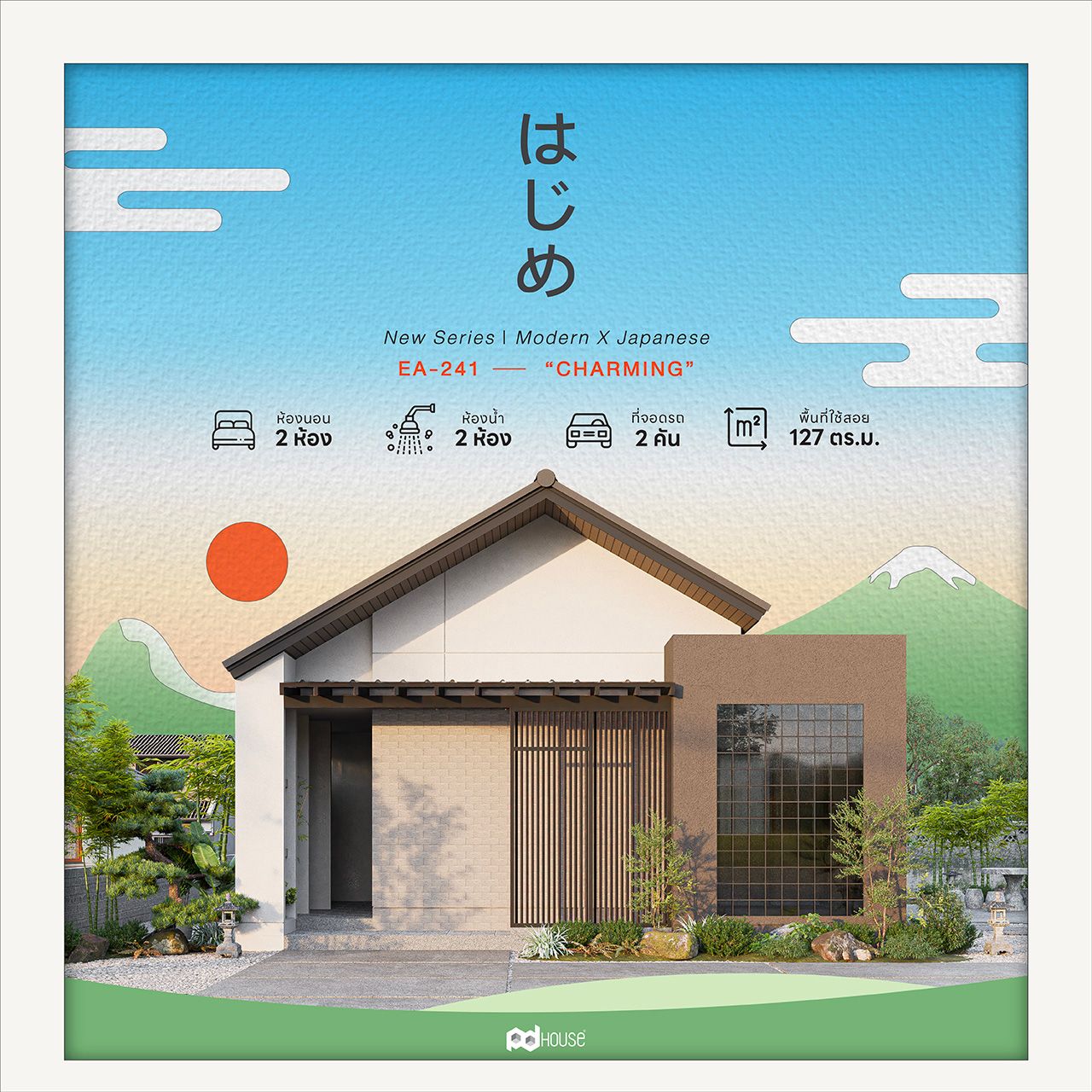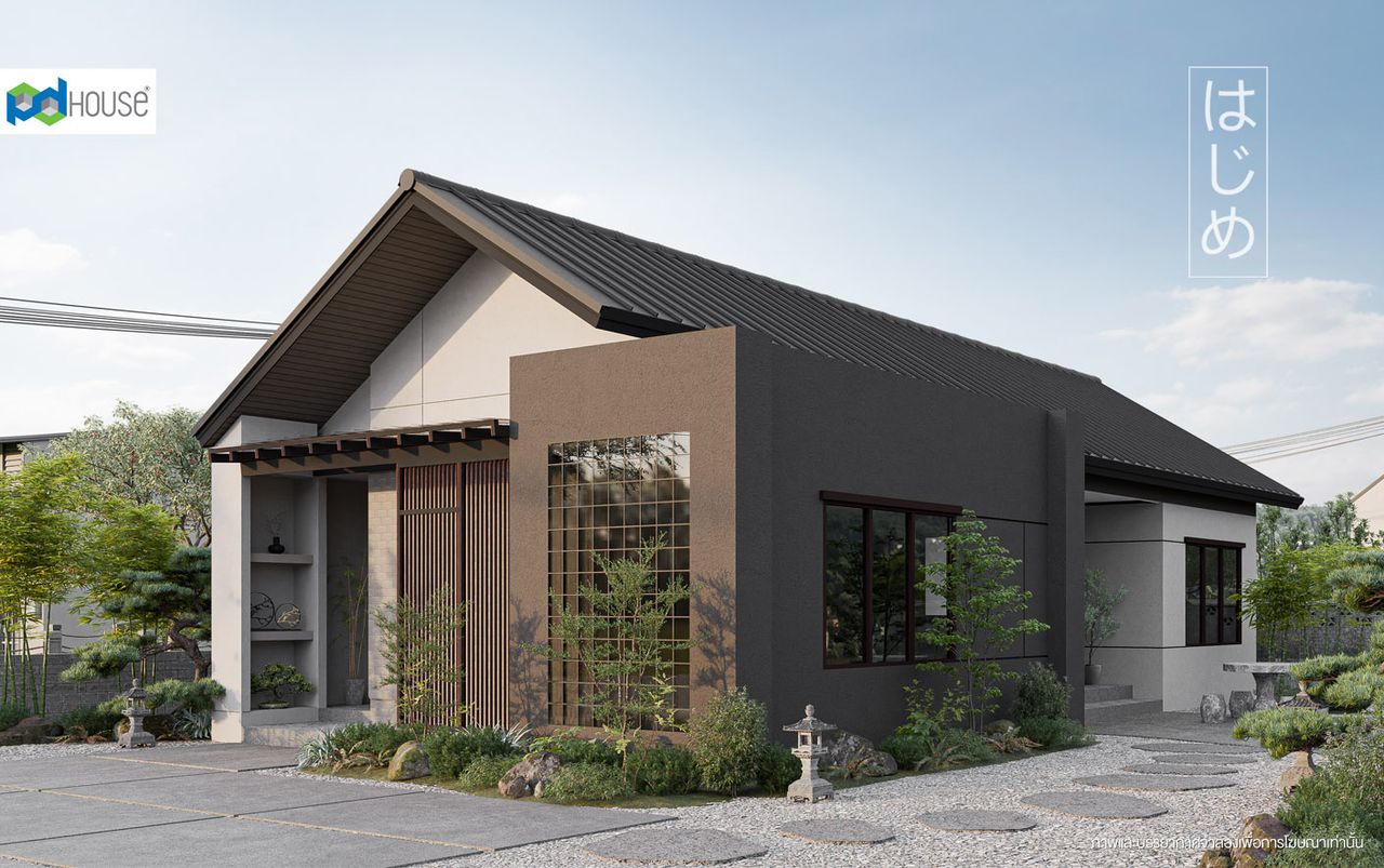 Hajime แบบบ้านใหม่สไตล์ Modern Japanese ที่โดดเด่นด้วยอัตลักษณ์ความเป็นบ้านแบบญี่ปุ่นที่ผสมผสานความโมเดิร์นไว้อย่างลงตัว สะดุดตาด้วยหลังคาปั้นหยาและทรงเรียบดูมีเอกลักษณ์เฉพาะตัว งดงามด้วยการตกแต่งด้วยระแนงเพื่อเพิ่มมิติให้กับตัวอาคารและช่วยลดทอนความร้อนไม่ให้เข้าสู่ภายในบ้าน โดยออกแบบให้ดูอบอุ่นเปิดพื้นที่โปร่งโล่ง มีลมพัดผ่านช่วยระบายความร้อนได้เป็นอย่างดี ทุกฟังก์ชันถูกออกแบบให้คุ้มค่าสอดรับกับการใช้งานและมีความสะดวกสบาย เพิ่มเติมด้วยพื้นที่สีเขียวโดยรอบอาคารเพื่อเพิ่มบรรยากาศในการอยู่อาศัย