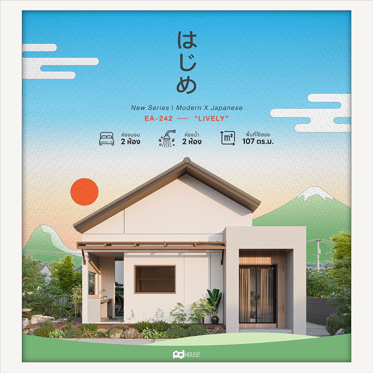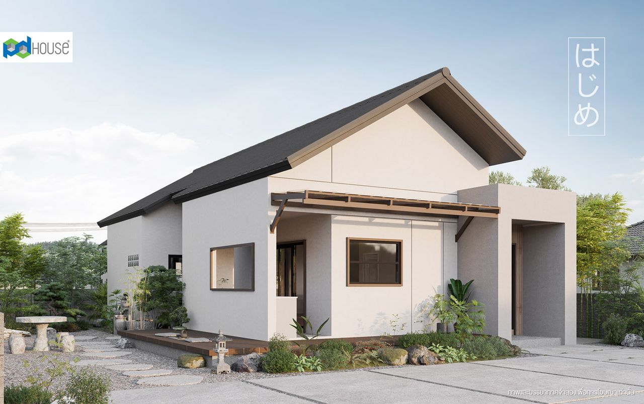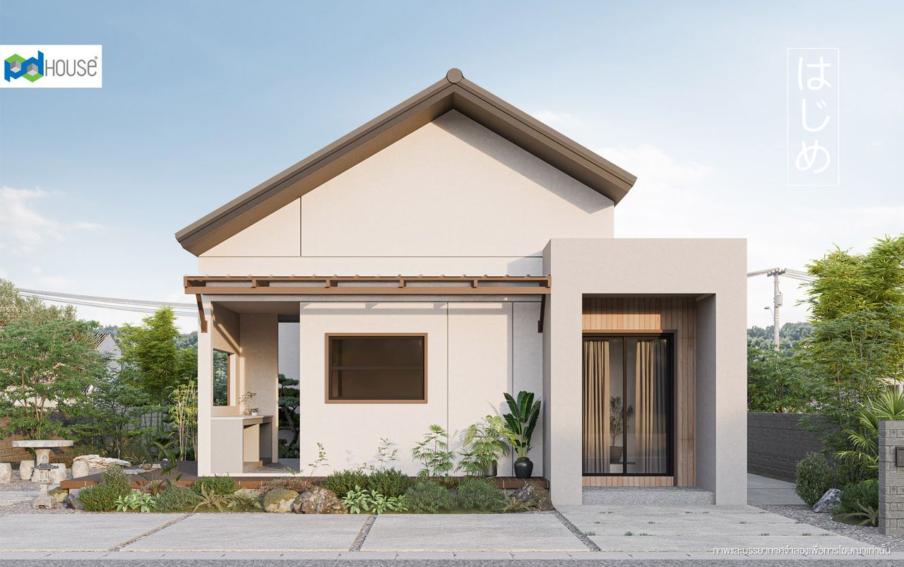 แบบบ้านชั้นเดียวที่ถูกดีไซน์ในรูปแบบบ้านญี่ปุ่น เน้นคุมโทนสีขาว-น้ำตาล ดูอบอุ่น เรียบง่าย ตัวบ้านถูกออกแบบให้ดูมีมิติและมีช่องแสงโดยรอบเพื่อเปิดรับลมหรือชื่นชมบรรยากาศจากภายนอก พร้อมออกแบบห้องครัวให้เป็นสัดส่วนเชื่อมต่อกับเฉลียงด้านนอกป้องกันกลิ่นอาหารเข้ามารบกวนภายในบ้าน ส่วนฟังชันภายในถูกออกแบบให้รองรับกับการใช้งาน และจัดสรรไว้อย่างลงตัว คุ้มค่าทุกพื้นที่ใช้สอย สอดรับกับการใช้งานของทุกช่วงชีวิต