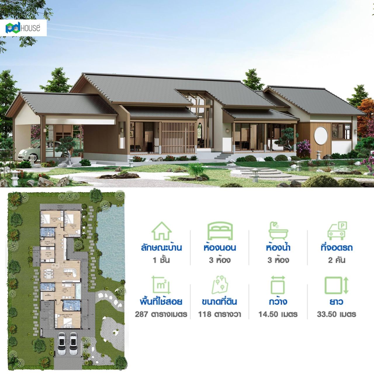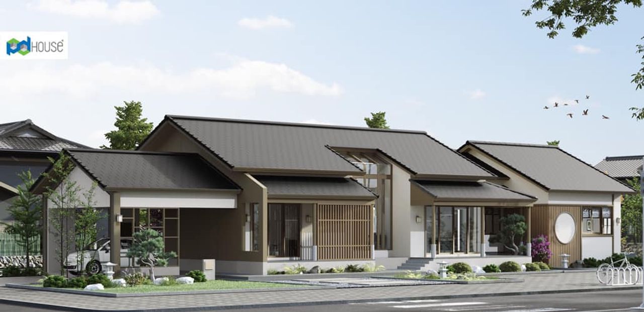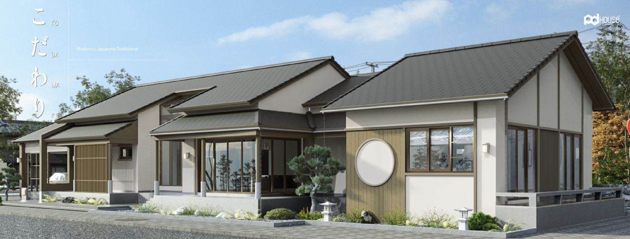 บ้านชั้นเดียว สไตล์ญี่ปุ่น มีพื้นที่ใช้สอยที่ครบครัน เหมาะสำหรับพื้นที่ดินหน้าแคบ โดดเด่นด้วยรูปทรงของบ้านที่มีเอกลักษณ์ โดดเด่นด้วยหลังคาเล่นระดับและหลังคาโปร่งใสบริเวณห้องรับแขก พร้อมวัสดุตกแต่งอาคารเลียนแบบธรรมชาติ พื้นที่นั่งเล่นชานบ้านให้อารมณ์เหมือนบ้านญี่ปุ่นแบบดั้งเดิม โชว์ความสวยงามได้ทั้งด้านหน้าแคบและหน้ากว้างตามความเหมาะสมของขนาดที่ดิน