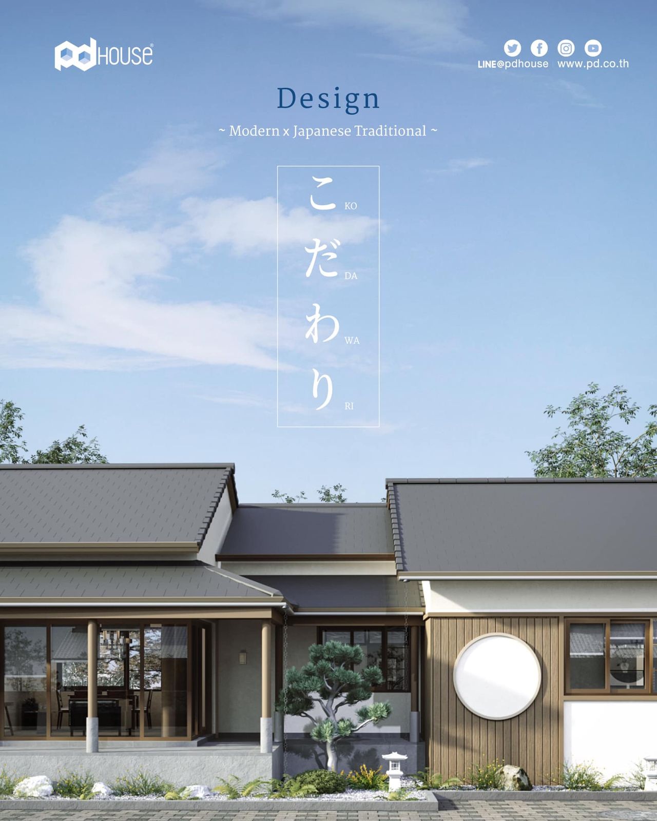 เป็นการผสมผสานระหว่างความโมเดิร์นและเอกลักษณ์บ้านญี่ปุ่น โดยผู้ออกแบบได้ยึดตามหลักปรัชญา “โคดาวาริ” ของญี่ปุ่นในการออกแบบอย่างพิถีพิถัน และใส่ใจทุกรายละเอียดของการออกแบบบ้านทั้ง 4 แบบ ตลอดจนคำนึงถึงวิถีชีวิตและการอยู่อาศัยที่สมบูรณ์แบบ รวมทั้งยังมีองค์ประกอบบ้านญี่ปุ่นที่มีความเฉพาะตัวในแต่ละแบบ ด้วยวัสดุตกแต่งเปลือกอาคารที่เป็นระแนงไม้และหินตกแต่งเลียนแบบธรรมชาติ ทำให้บ้านดูโดดเด่นอย่างมีเอกลักษณ์และมีรสนิยมของผู้เป็นเจ้าของบ้าน