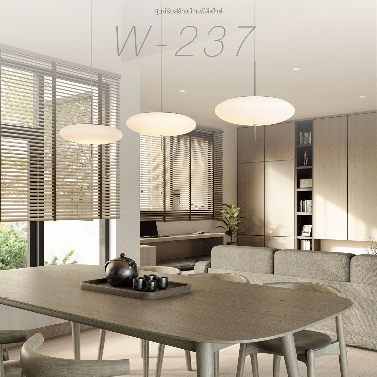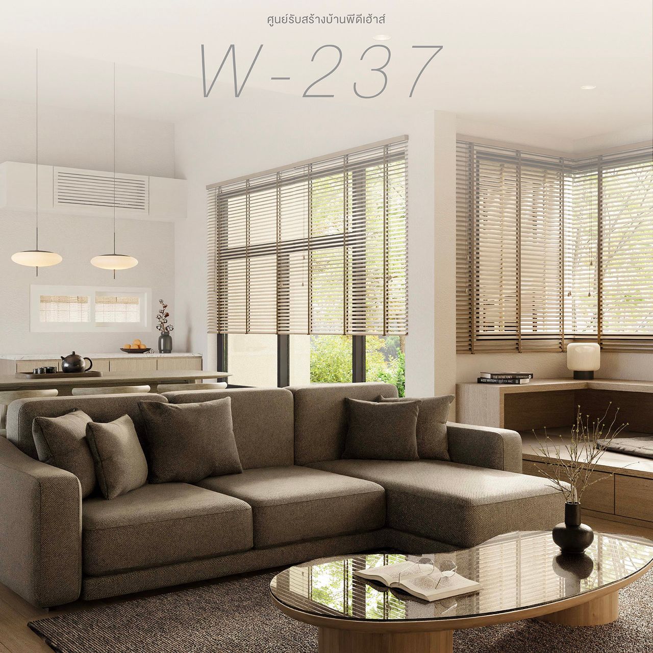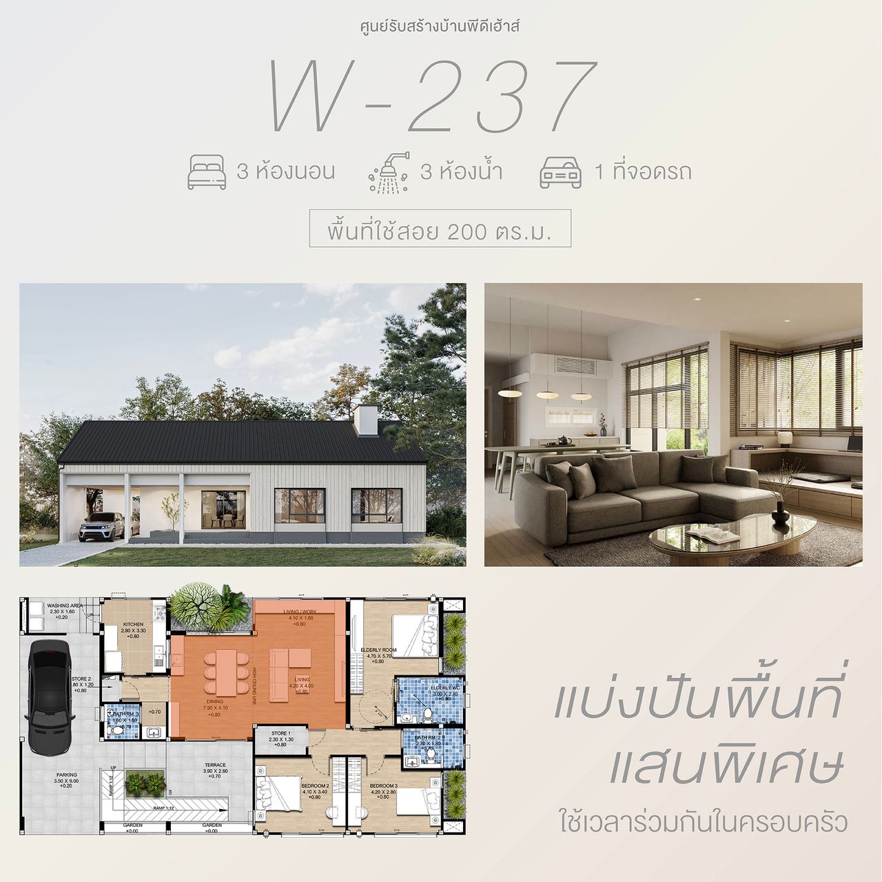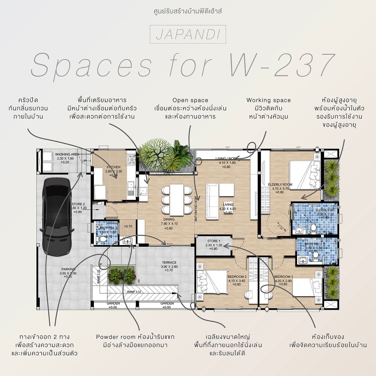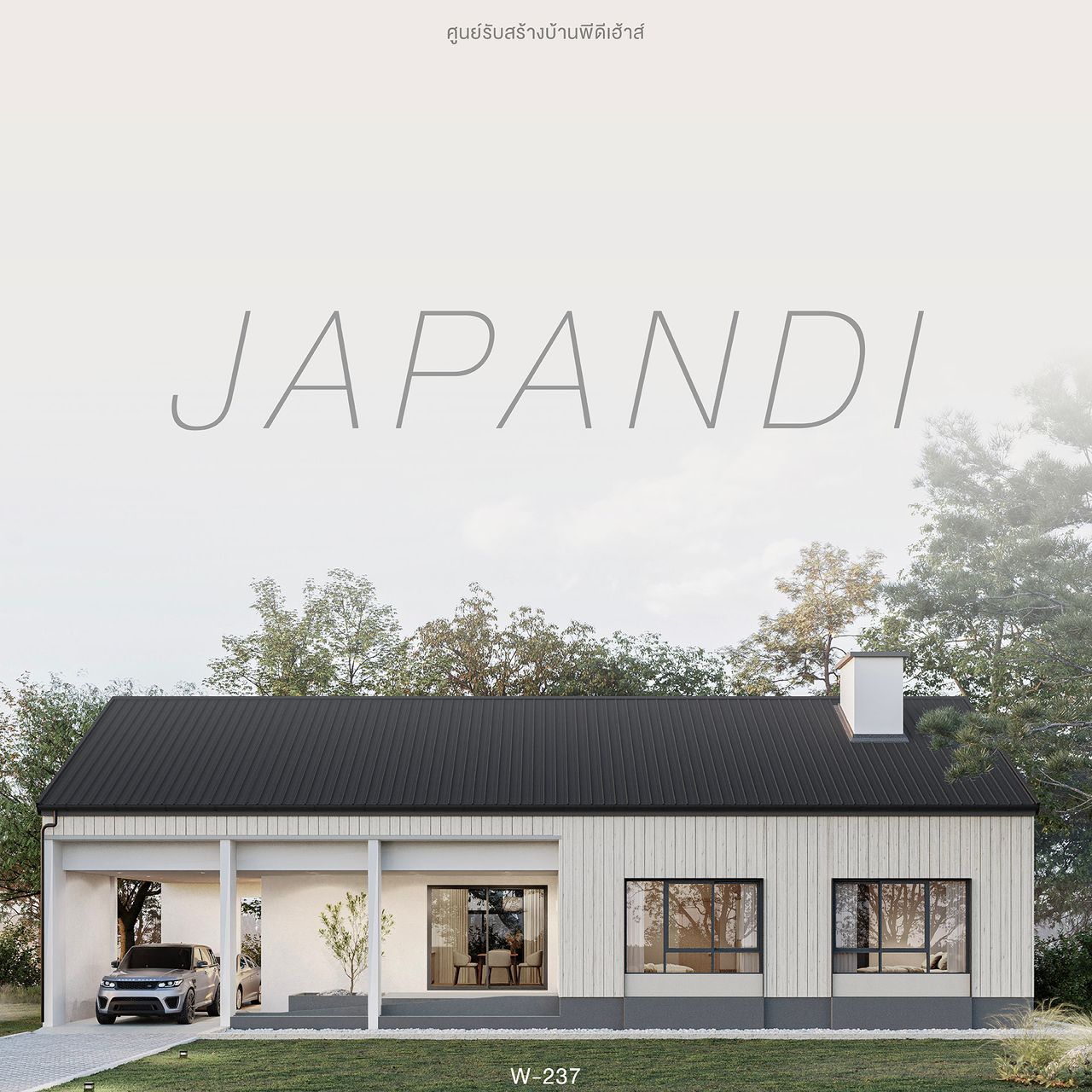บ้านชั้นเดียวที่ผสมผสานงานสถาปัตยกรรมของญี่ปุ่นและสแกนดิเนเวียนไว้อย่างลงตัว โดดเด่นด้วยรูปทรงที่มีเอกลักษณ์ พร้อมเฉลียงด้านหน้าที่สามารถจัดเป็นมุมพักผ่อนได้ ตัวบ้านถูกออกแบบให้มีช่องเปิดขนาดใหญ่โดยรอบมองเห็นบรรยากาศภายนอกได้อย่างใกล้ชิด ภายในถูกออกแบบให้ดูเรียบง่ายในสไตล์ Minimal แต่แฝงไว้ด้วยความทันสมัยเพื่อให้สอดรับการการใช้งานในยุคปัจจุบัน คุ้มค่าด้วยการจัดวางพื้นที่ใช้สอยให้เชื่อมต่อกันพร้อมห้องนอนผู้สูงอายุที่มีห้องน้ำในตัวและอุปกรณ์รองรับการใช้งาน ภายในคุมโทนสีที่อ่อนเพื่อให้ดูอบอุ่นสบายตา ตอบรับการอยู่อาศัยได้อย่างสมบูรณ์แบบ